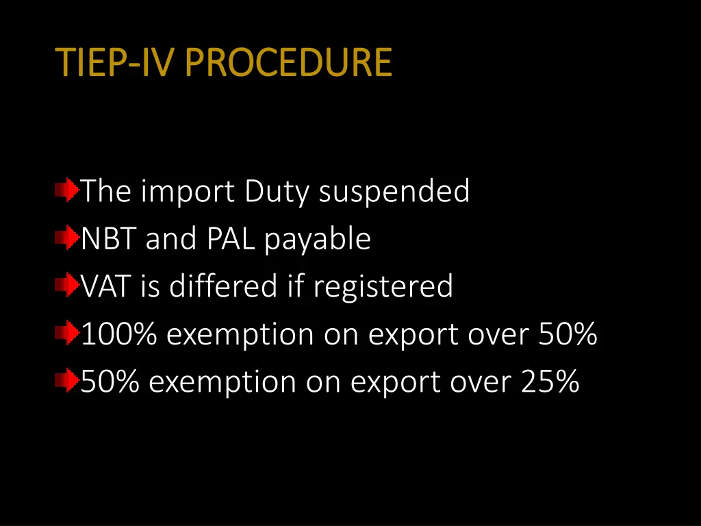 TIEP TIEP- -IV PROCEDURE IV PROCEDURE The import Duty suspended NBT and PAL payable VAT is differed if registered 100% exemption on export over 50% 50% exemption on export over 25%