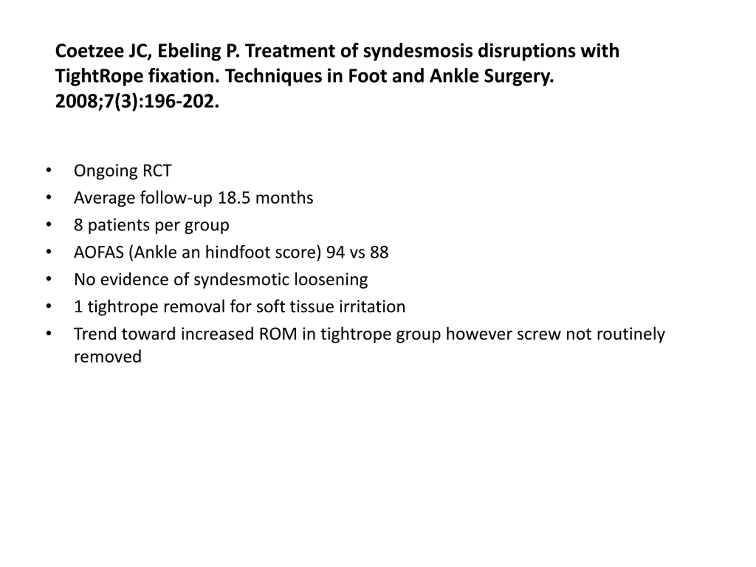 Coetzee JC, Ebeling P. Treatment of syndesmosis disruptions with TightRope fixation. Techniques in Foot and Ankle Surgery. 2008;7(3):196-202. Ongoing RCT Average follow-up 18.5 months 8 patients per group AOFAS (Ankle an hindfoot score) 94 vs 88 No evidence of syndesmotic loosening 1 tightrope removal for soft tissue irritation Trend toward increased ROM in tightrope group however screw not routinely removed