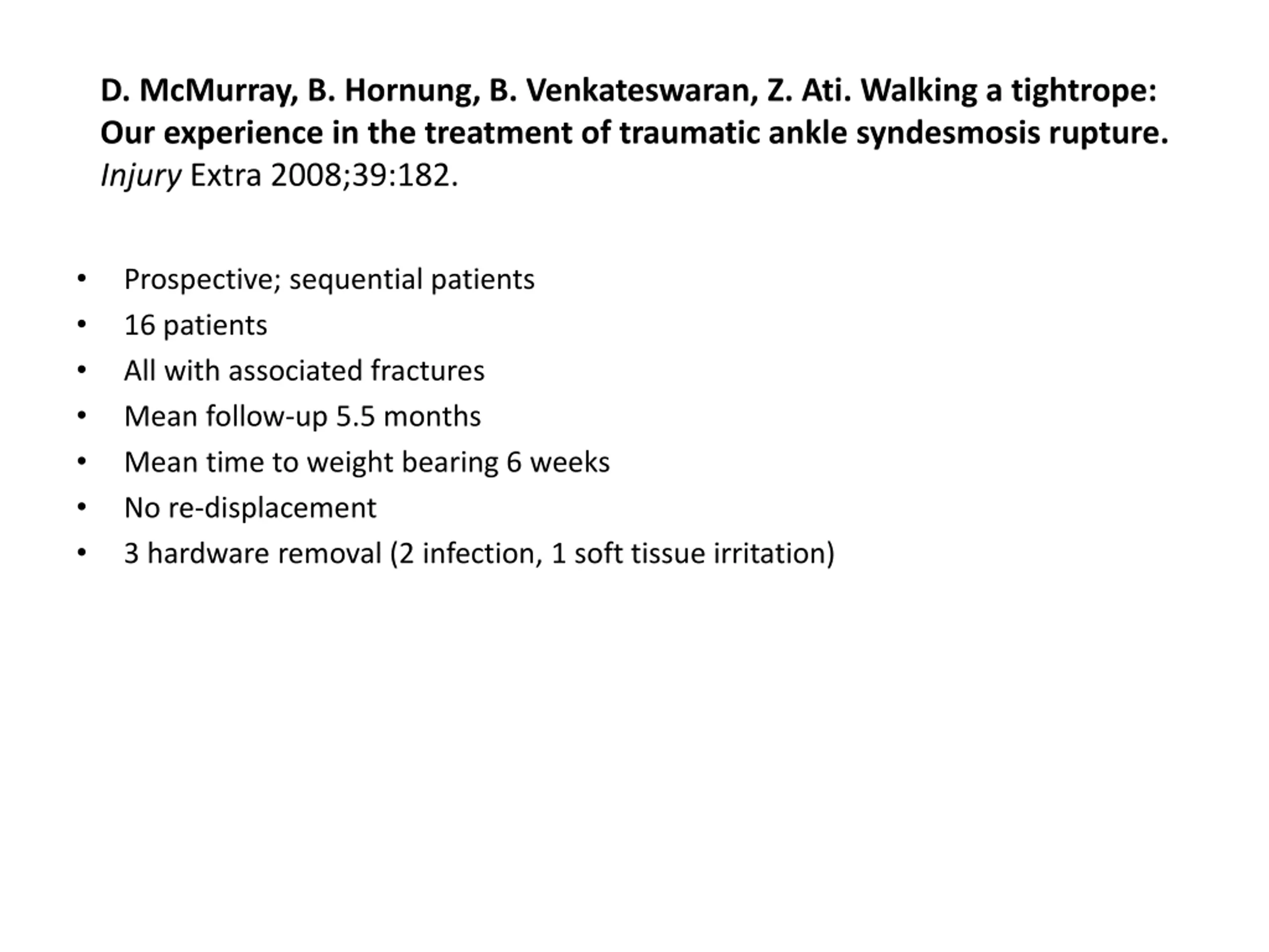 D. McMurray, B. Hornung, B. Venkateswaran, Z. Ati. Walking a tightrope: Our experience in the treatment of traumatic ankle syndesmosis rupture. Injury Extra 2008;39:182. Prospective; sequential patients 16 patients All with associated fractures Mean follow-up 5.5 months Mean time to weight bearing 6 weeks No re-displacement 3 hardware removal (2 infection, 1 soft tissue irritation)