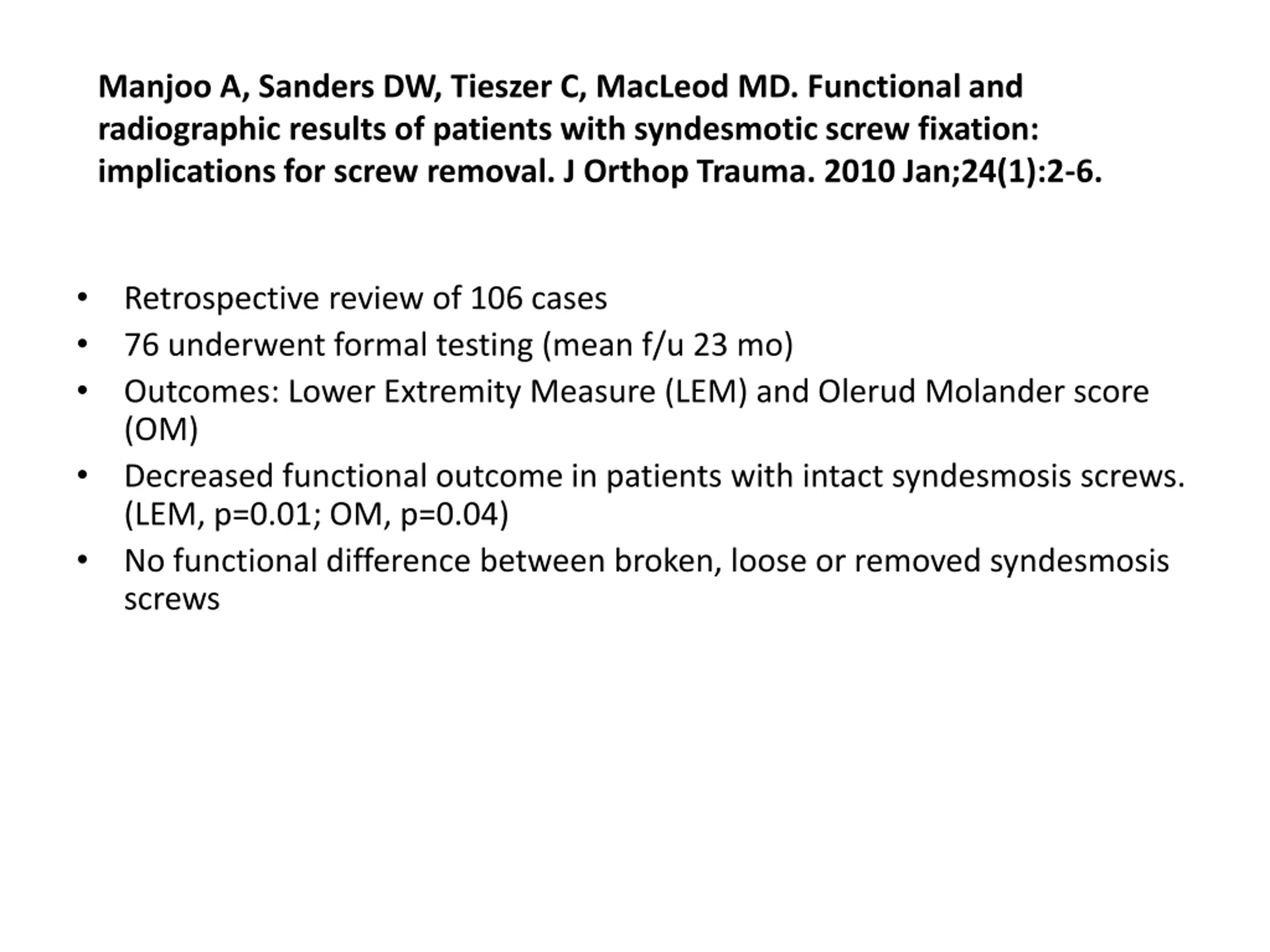 Manjoo A, Sanders DW, Tieszer C, MacLeod MD. Functional and radiographic results of patients with syndesmotic screw fixation: implications for screw removal. J Orthop Trauma. 2010 Jan;24(1):2-6. Retrospective review of 106 cases 76 underwent formal testing (mean f/u 23 mo) Outcomes: Lower Extremity Measure (LEM) and Olerud Molander score (OM) Decreased functional outcome in patients with intact syndesmosis screws. (LEM, p=0.01; OM, p=0.04) No functional difference between broken, loose or removed syndesmosis screws
