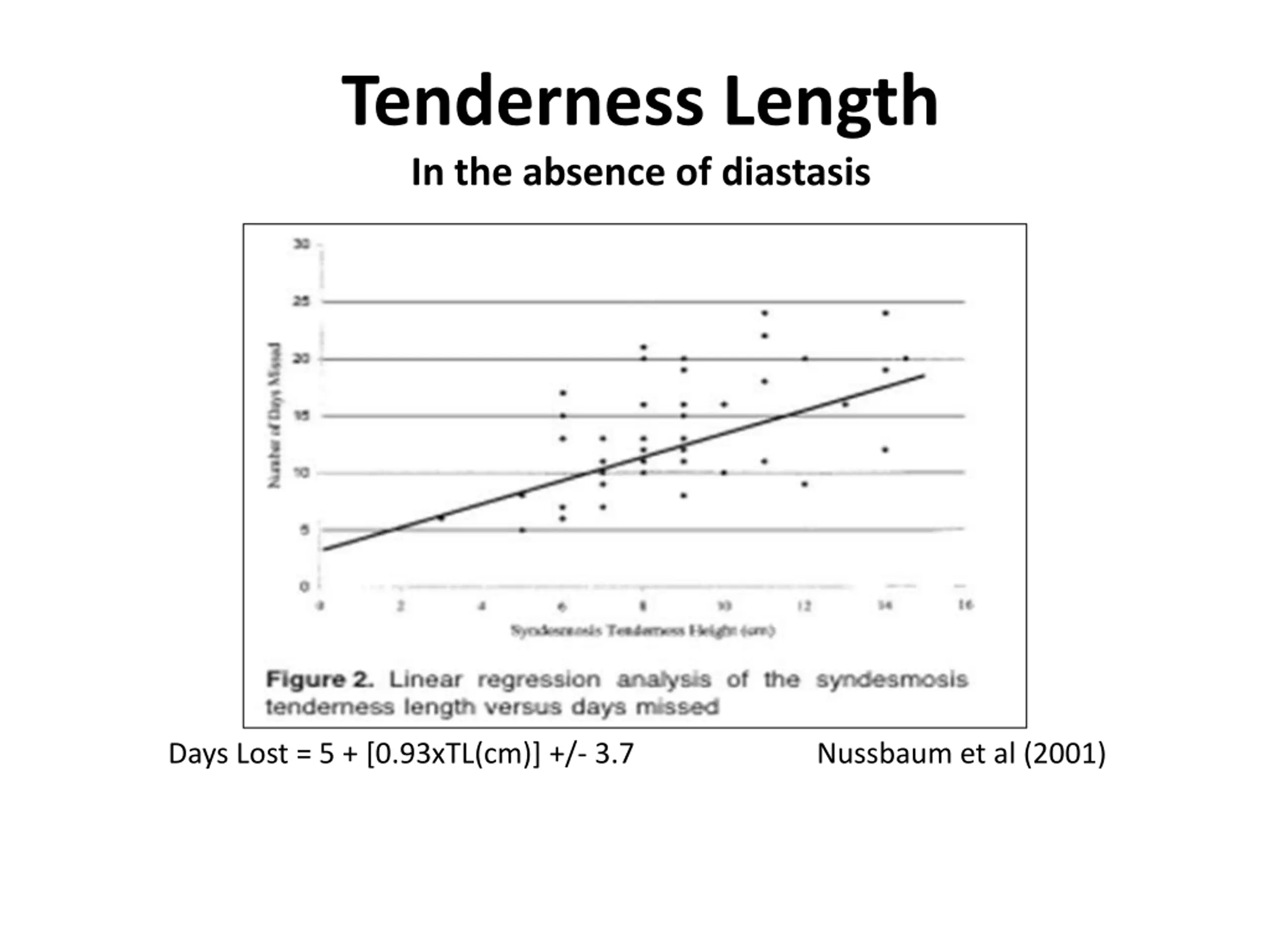 Tenderness Length In the absence of diastasis Length of tenderness measured from tip of lateral malleolus correlates with time to return to sport in sprains with no diastasis Nussbaum et al (2001)