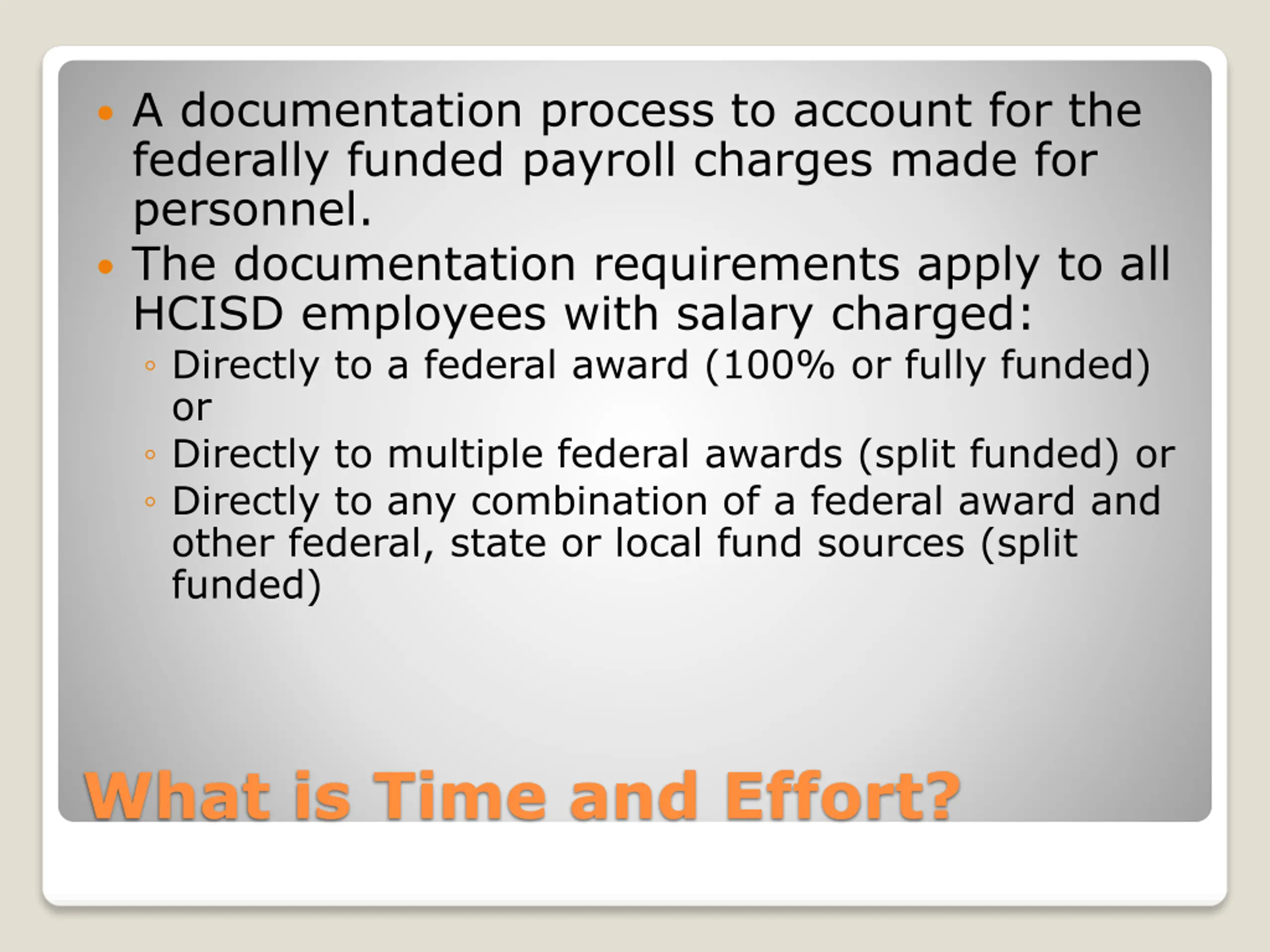A documentation process to account for the federally funded payroll charges made for personnel. The documentation requirements apply to all HCISD employees with salary charged: Directly to a federal award (100% or fully funded) or Directly to multiple federal awards (split funded) or Directly to any combination of a federal award and other federal, state or local fund sources (split funded) What is Time and Effort?