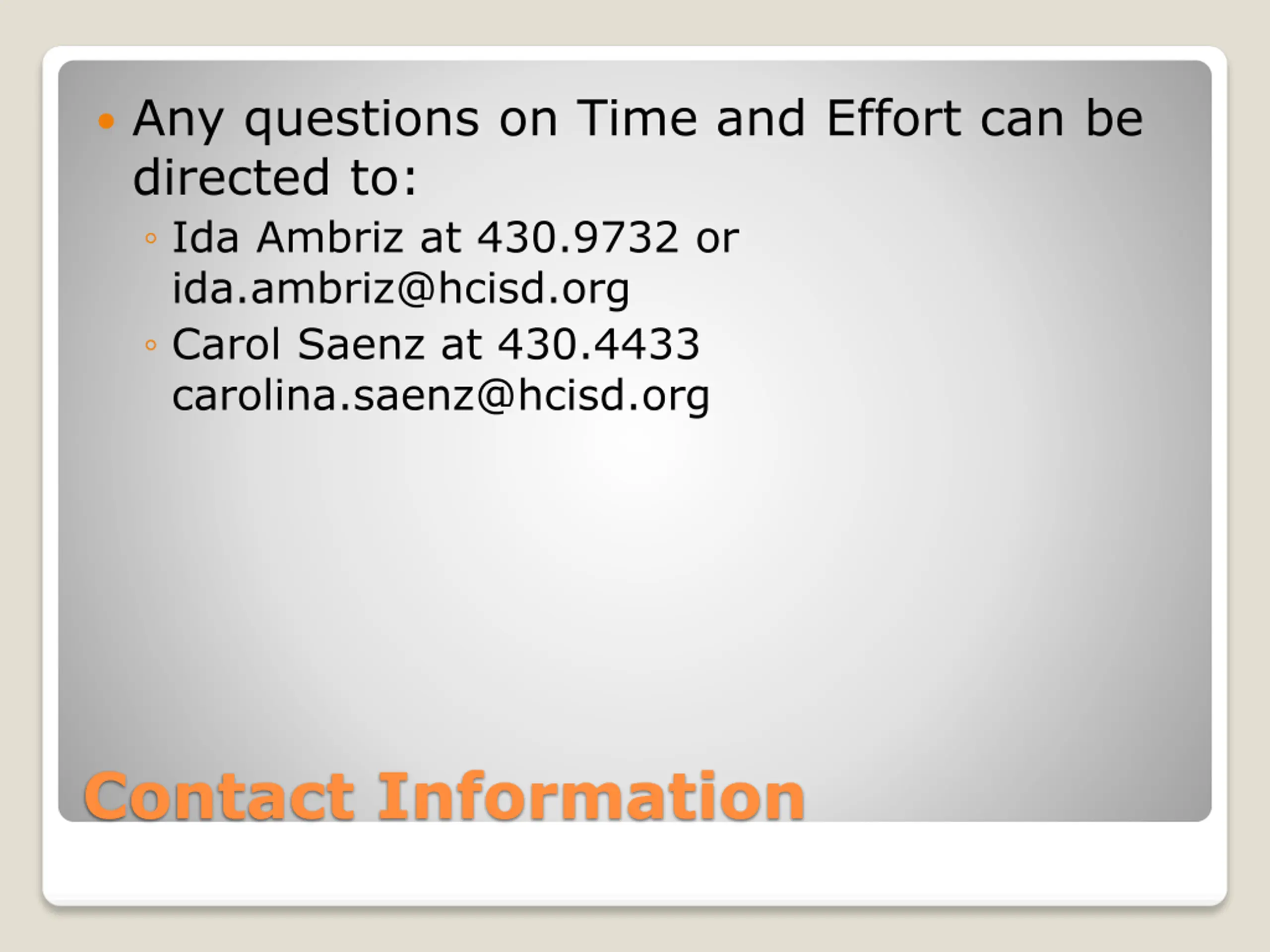 Any questions on Time and Effort can be directed to: Ida Ambriz at 430.9732 or ida.ambriz@hcisd.org Carol Saenz at 430.4433 carolina.saenz@hcisd.org Contact Information