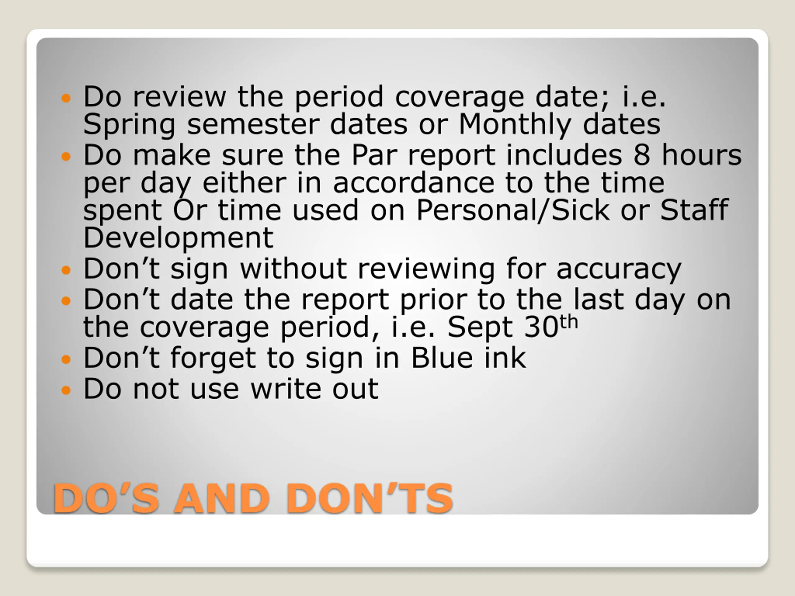 Do review the period coverage date; i.e. Spring semester dates or Monthly dates Do make sure the Par report includes 8 hours per day either in accordance to the time spent Or time used on Personal/Sick or Staff Development Don t sign without reviewing for accuracy Don t date the report prior to the last day on the coverage period, i.e. Sept 30th Don t forget to sign in Blue ink Do not use write out DO S AND DON TS