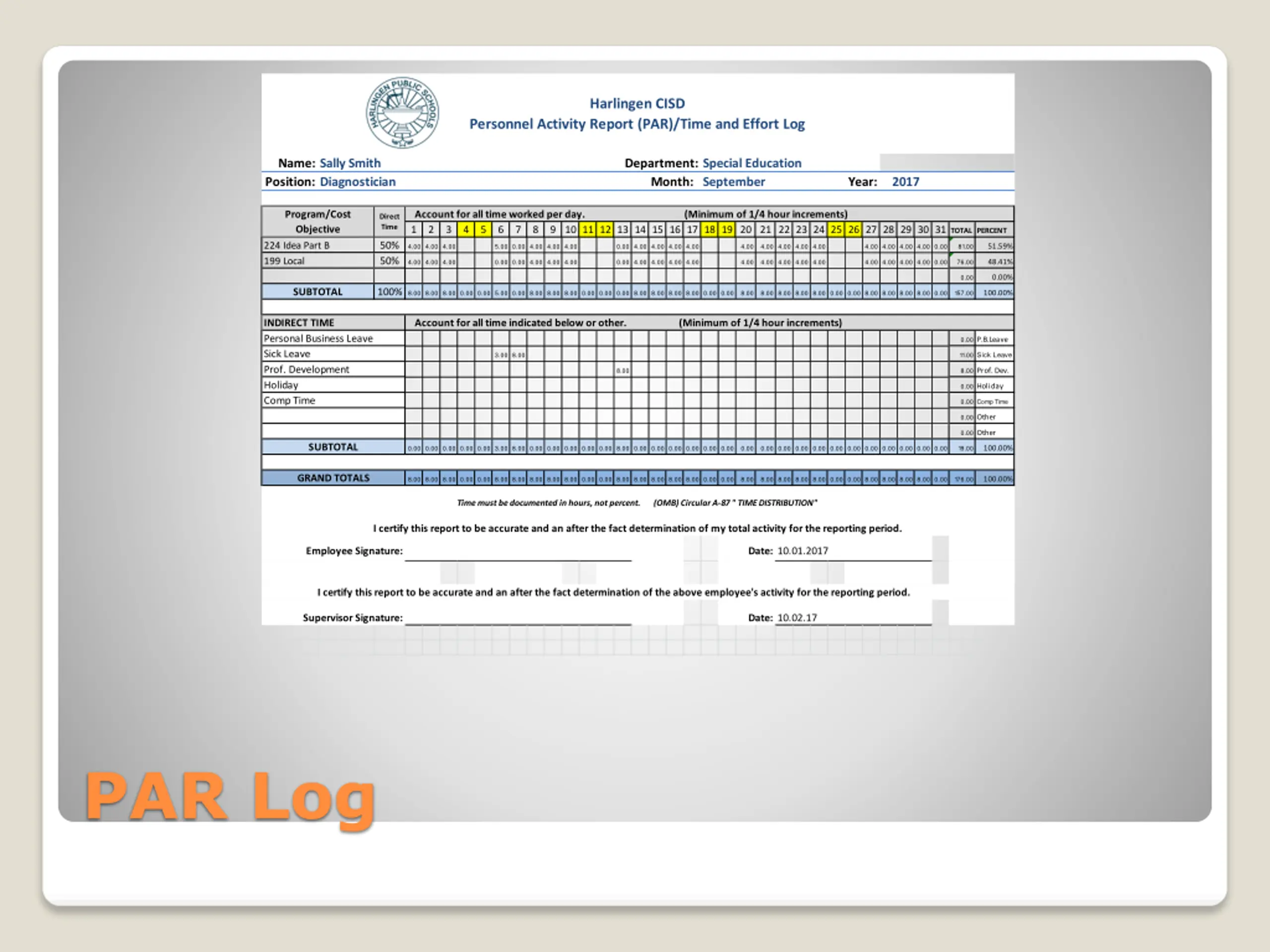 Personnel Activity Report Log (PAR) Who works under multiple grant programs; or Who works under multiple cost objectives Each employee must prepare PAR logs, at least monthly, to coincide with pay periods. Such reports must reflect an after-the-fact distribution of 100 percent of the actual time spent on each activity and must be signed by the employee and supervisor. Type of Documentation
