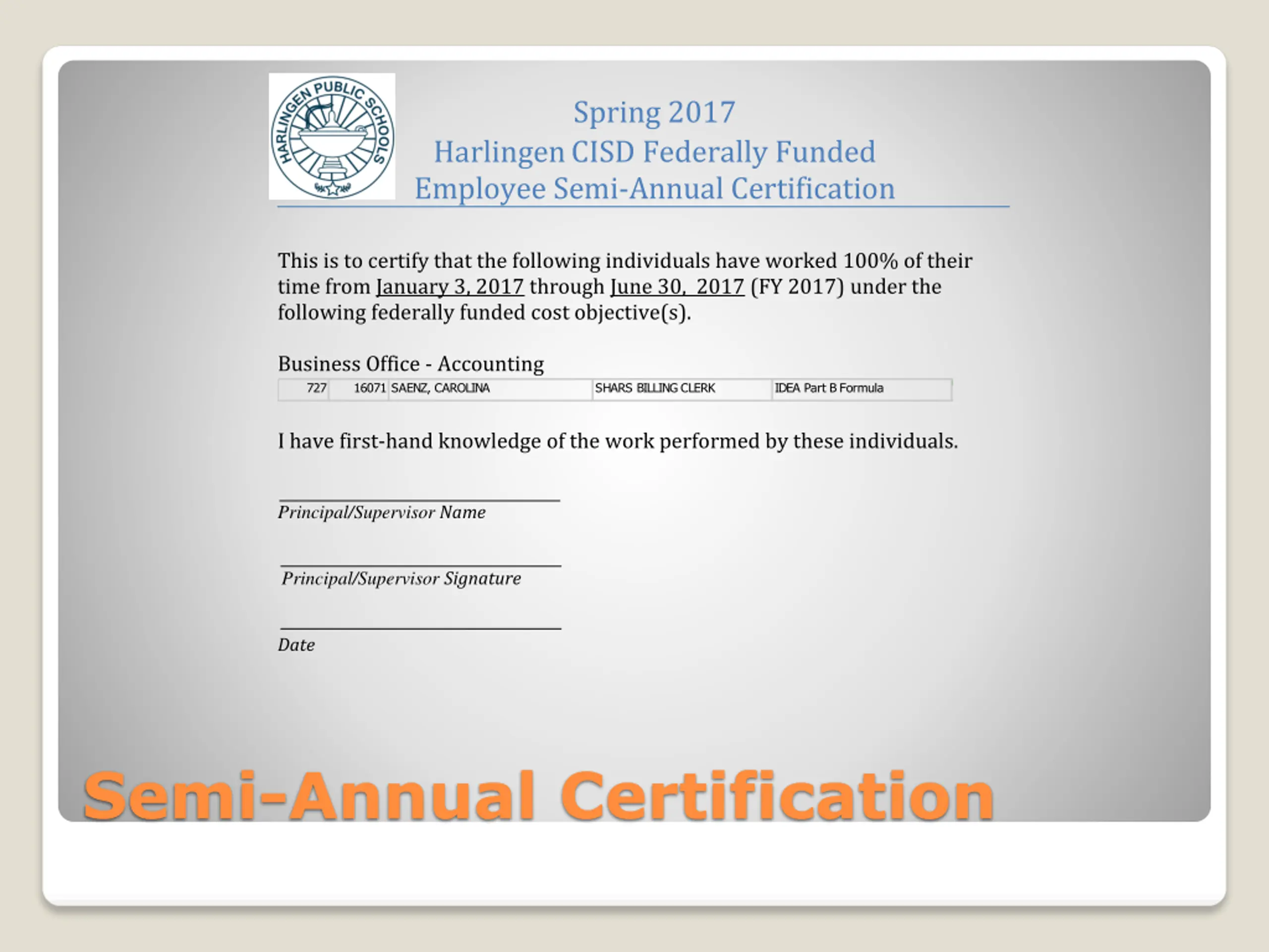 Spring 2017 Harlingen CISD Federally Funded Employee Semi-Annual Certification This is to certify that the following individuals have worked 100% of their time from January 3, 2017 through June 30, 2017 (FY 2017) under the following federally funded cost objective(s). Business Office - Accounting 727 16071 SAENZ, CAROLINA SHARS BILLING CLERK I have first-hand knowledge of the work performed by these individuals. Principal/Supervisor Name Principal/Supervisor Signature Date IDEA Part B Formula Semi-Annual Certification