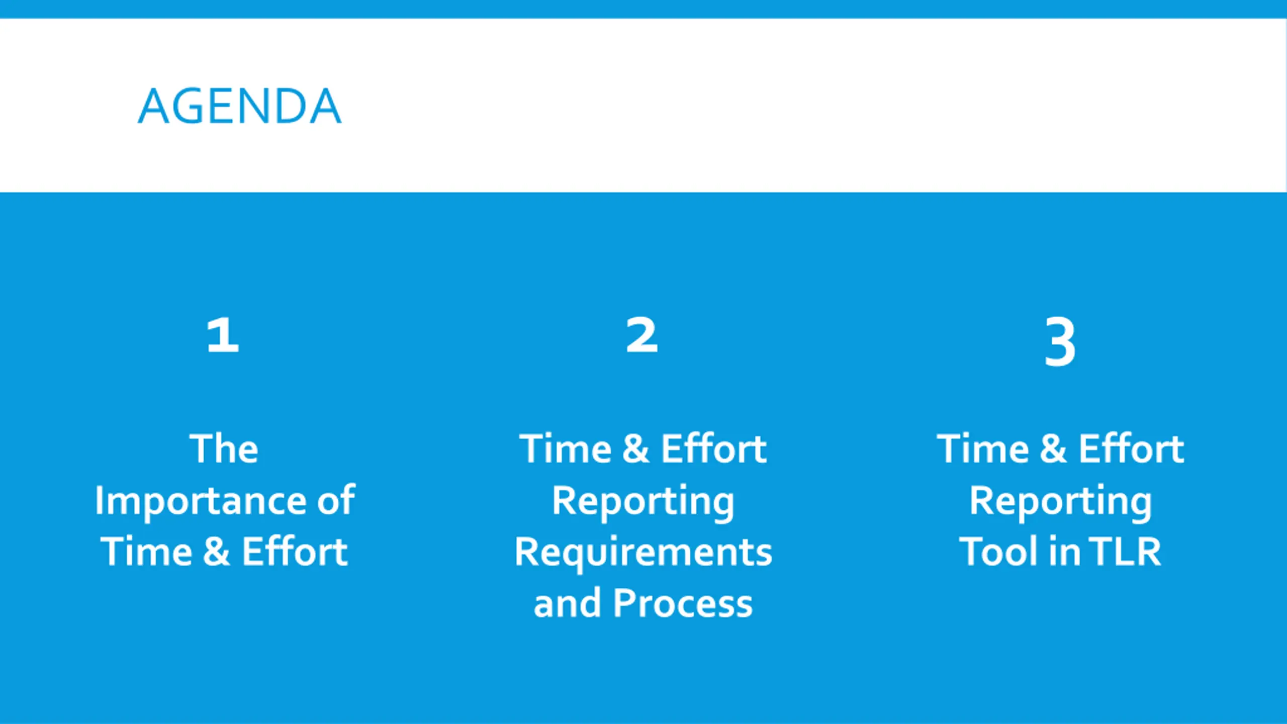 AGENDA 1 2 3 The Time & Effort Reporting Requirements and Process Time & Effort Reporting Tool in TLR Importance of Time & Effort