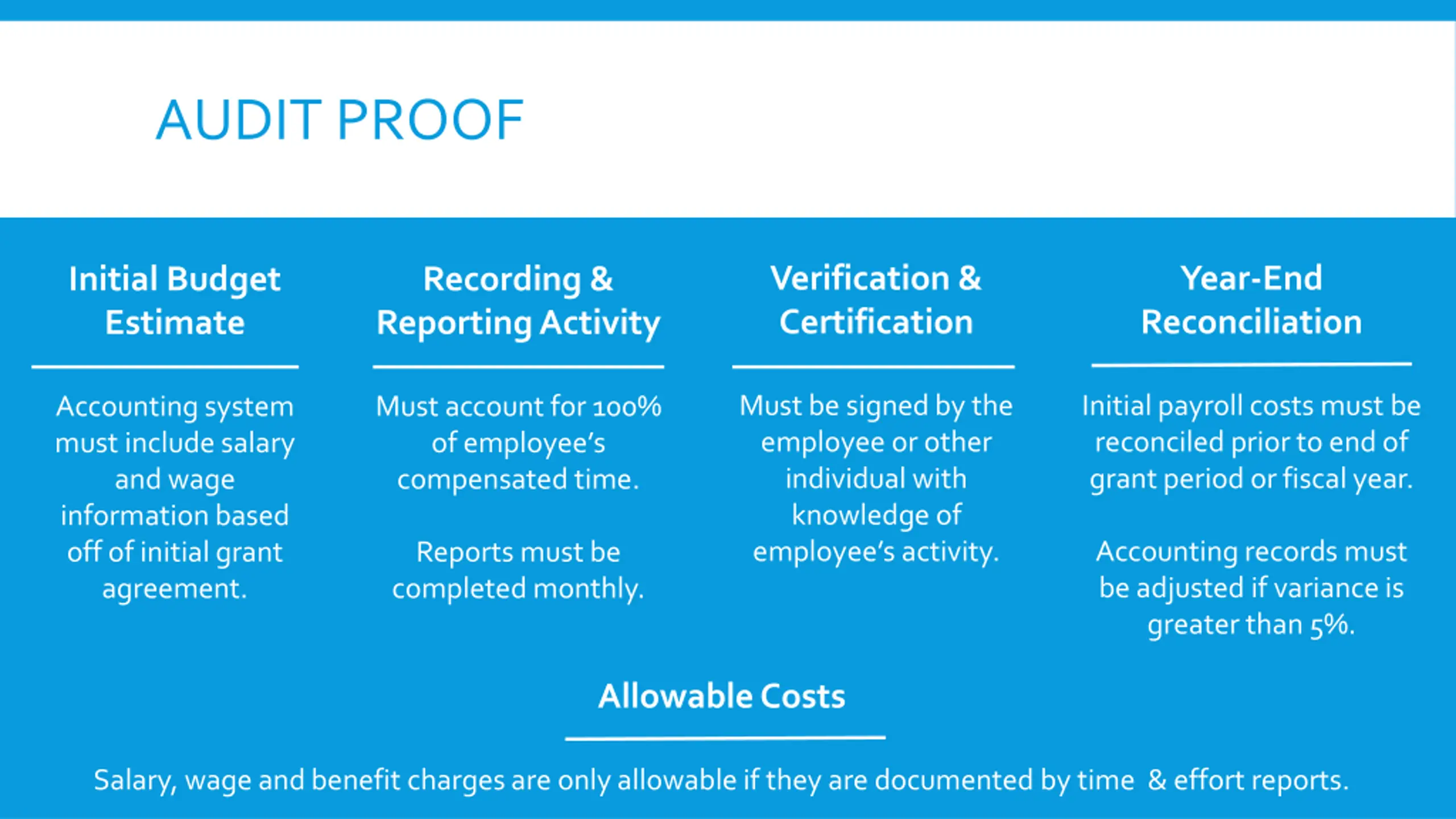 AUDIT PROOF Verification & Certification Year-End Reconciliation Initial Budget Estimate Recording & Reporting Activity Must be signed by the employee or other individual with knowledge of employee s activity. Initial payroll costs must be reconciled prior to end of grant period or fiscal year. Accounting system must include salary and wage information based off of initial grant agreement. Must account for 100% of employee s compensated time. Accounting records must be adjusted if variance is greater than 5%. Reports must be completed monthly. Allowable Costs Salary, wage and benefit charges are only allowable if they are documented by time & effort reports.
