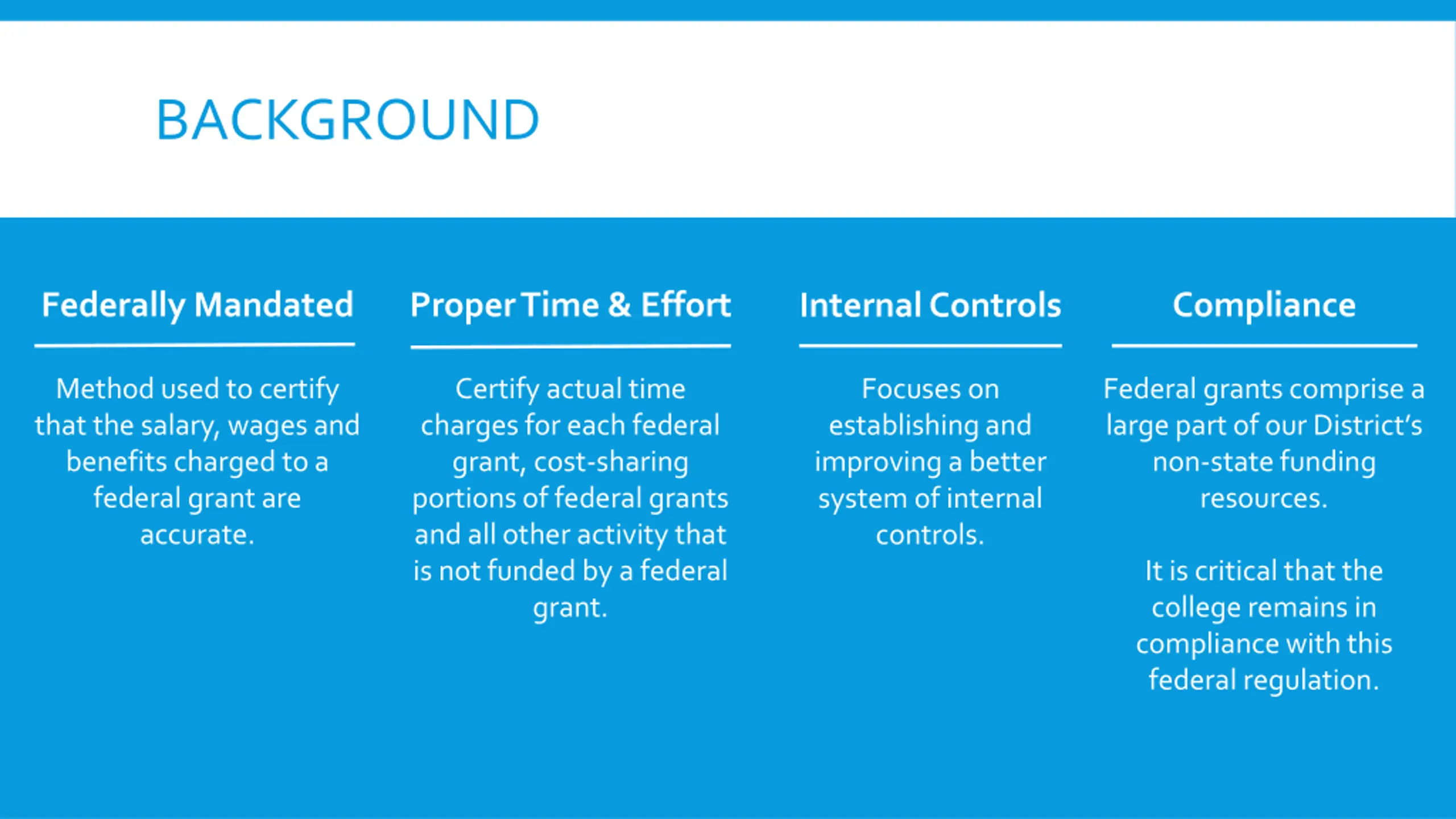 BACKGROUND Federally Mandated Proper Time & Effort Compliance Internal Controls Method used to certify that the salary, wages and benefits charged to a federal grant are accurate. Certify actual time charges for each federal grant, cost-sharing portions of federal grants and all other activity that is not funded by a federal grant. Federal grants comprise a large part of our District s non-state funding resources. Focuses on establishing and improving a better system of internal controls. It is critical that the college remains in compliance with this federal regulation.