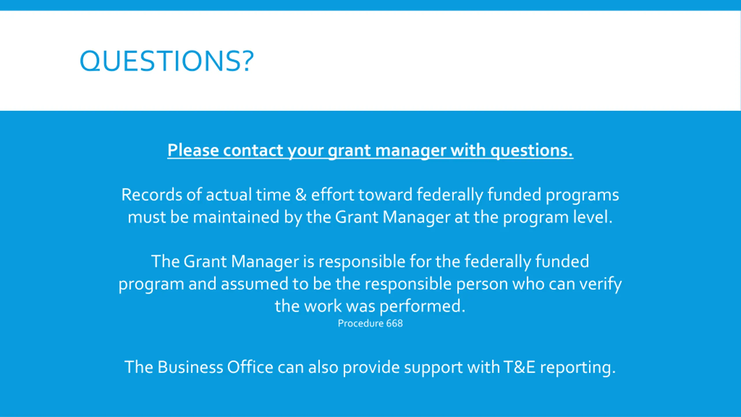 QUESTIONS? Please contact your grant manager with questions. Records of actual time & effort toward federally funded programs must be maintained by the Grant Manager at the program level. The Grant Manager is responsible for the federally funded program and assumed to be the responsible person who can verify the work was performed. Procedure 668 The Business Office can also provide support with T&E reporting.
