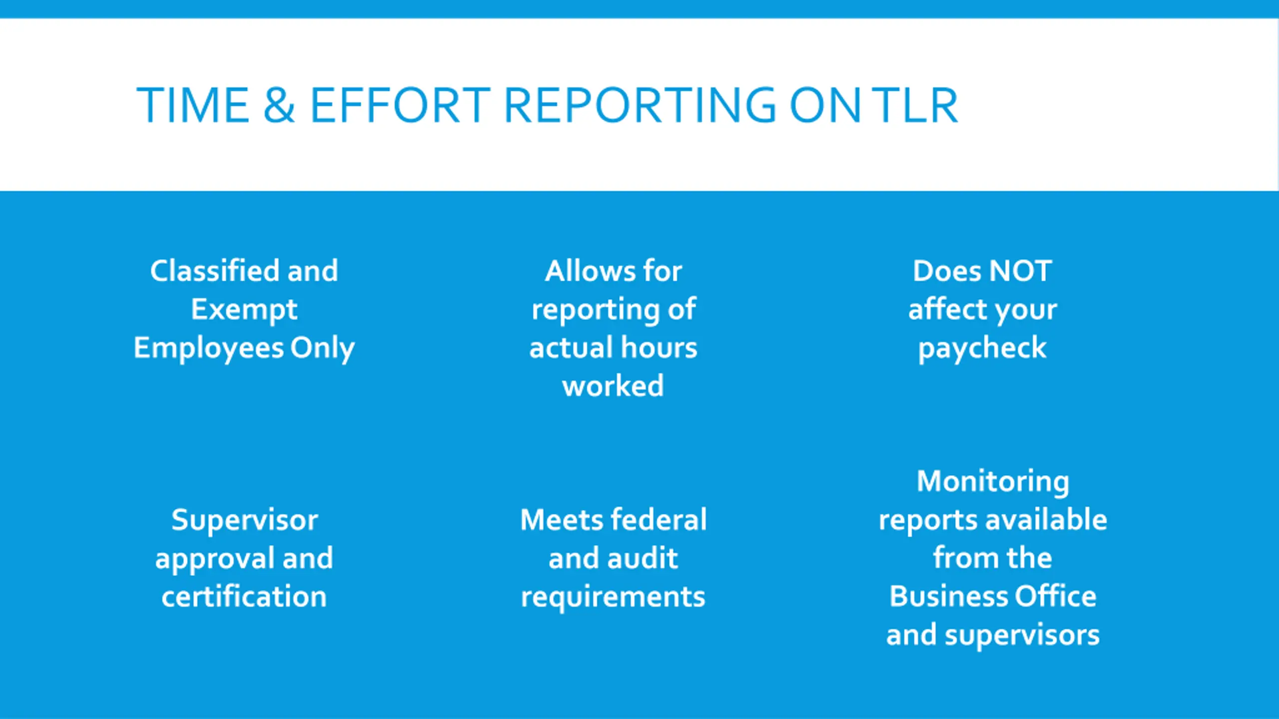 TIME & EFFORT REPORTING ON TLR Classified and Exempt Employees Only Allows for reporting of actual hours worked Does NOT affect your paycheck Monitoring reports available from the Business Office and supervisors Supervisor approval and certification Meets federal and audit requirements