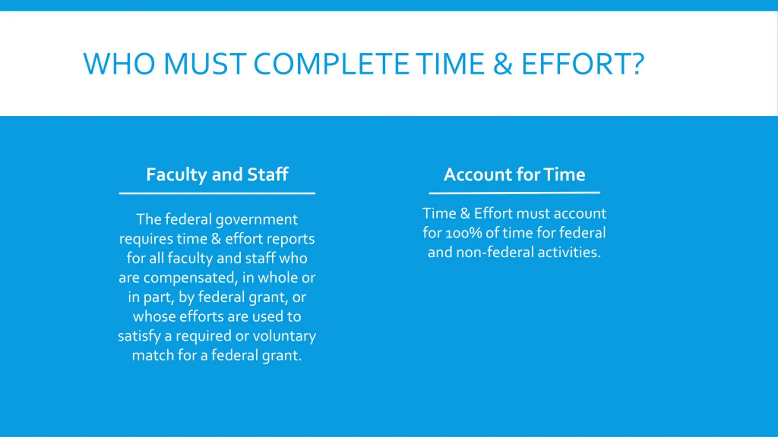 WHO MUST COMPLETE TIME & EFFORT? Faculty and Staff Account for Time Time & Effort must account for 100% of time for federal and non-federal activities. The federal government requires time & effort reports for all faculty and staff who are compensated, in whole or in part, by federal grant, or whose efforts are used to satisfy a required or voluntary match for a federal grant.