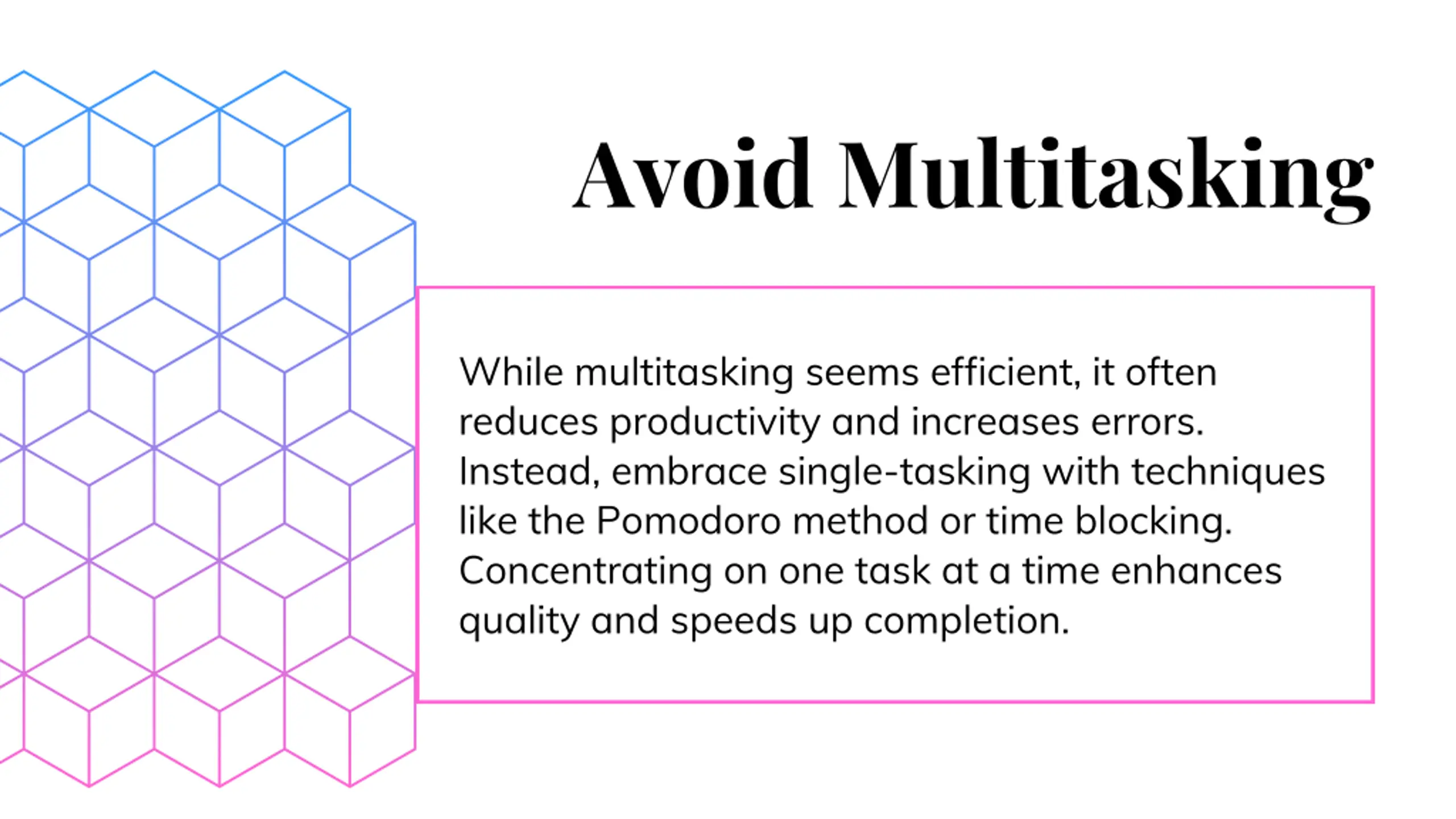 Avoid Multitasking While multitasking seems efficient, it often reduces productivity and increases errors. Instead, embrace single-tasking with techniques like the Pomodoro method or time blocking. Concentrating on one task at a time enhances quality and speeds up completion.