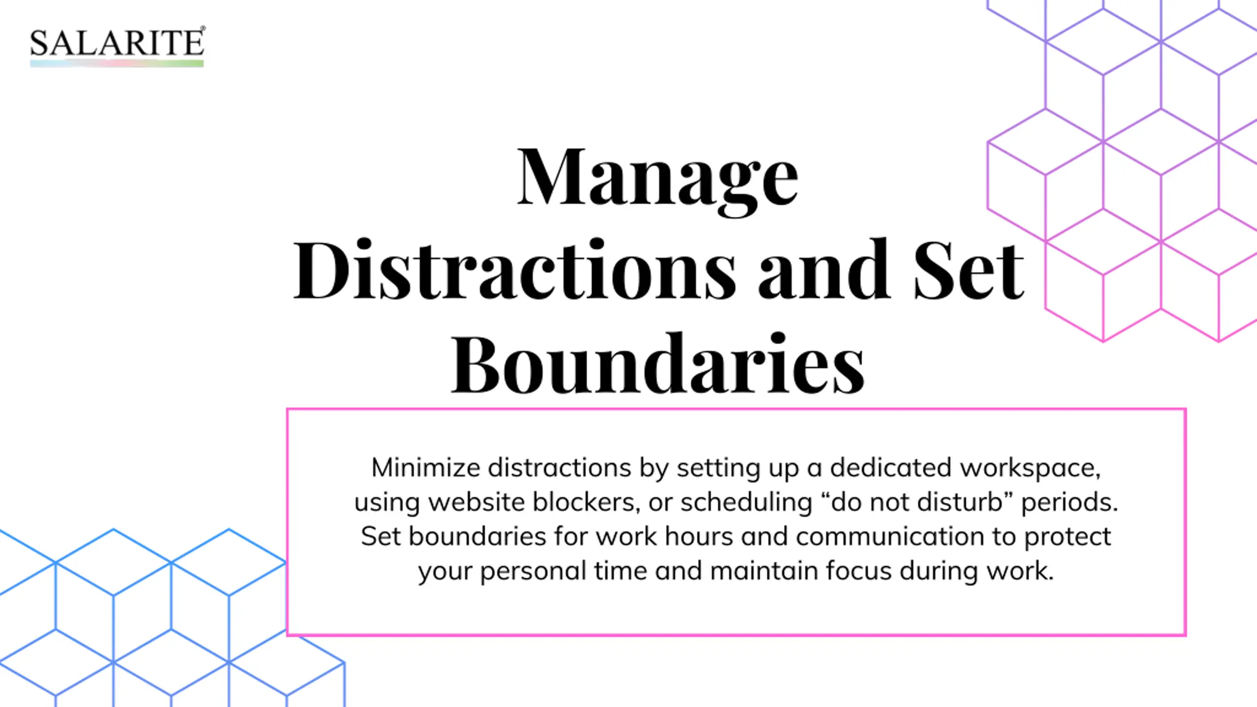 Manage Distractions and Set Boundaries Minimize distractions by setting up a dedicated workspace, using website blockers, or scheduling do not disturb periods. Set boundaries for work hours and communication to protect your personal time and maintain focus during work.