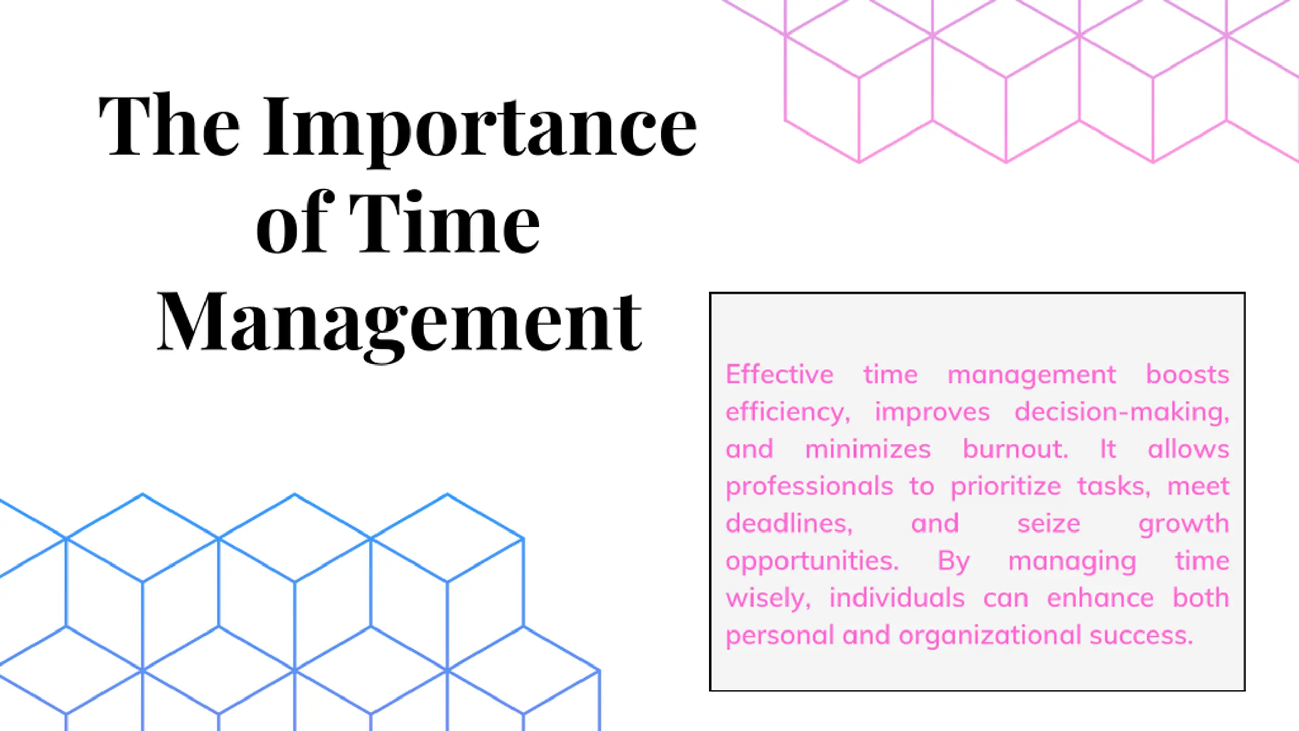 The Importance of Time Management Effective time management boosts efficiency, improves decision-making, and minimizes burnout. It allows professionals to prioritize tasks, meet deadlines, and opportunities. By wisely, individuals can enhance both personal and organizational success. seize managing growth time