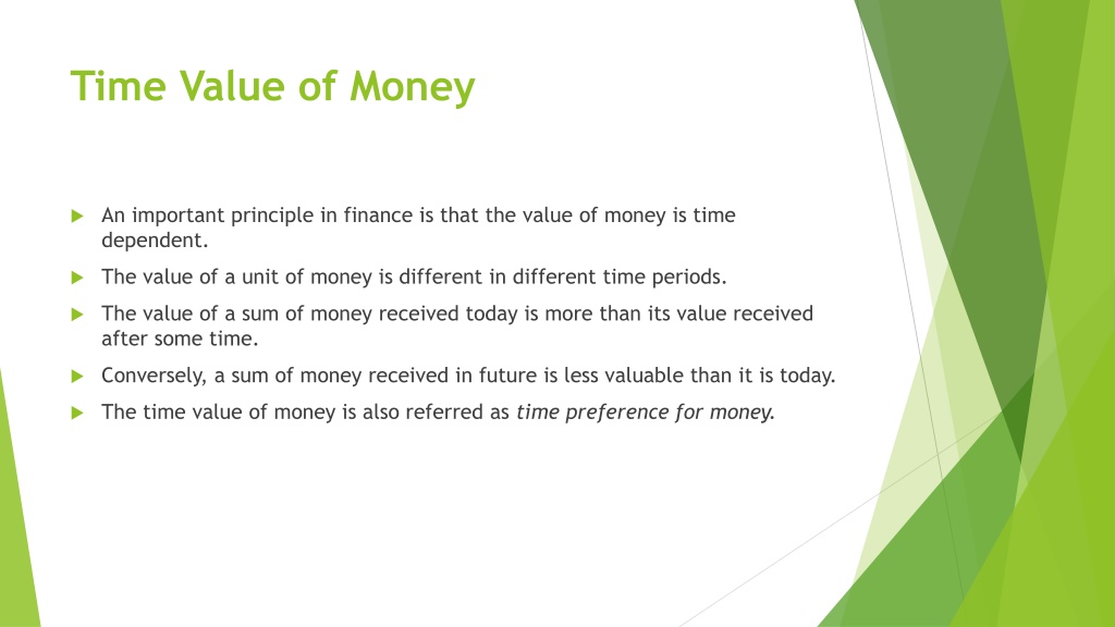Time Value of Money An important principle in finance is that the value of money is time dependent. The value of a unit of money is different in different time periods. The value of a sum of money received today is more than its value received after some time. Conversely, a sum of money received in future is less valuable than it is today. The time value of money is also referred as time preference for money.