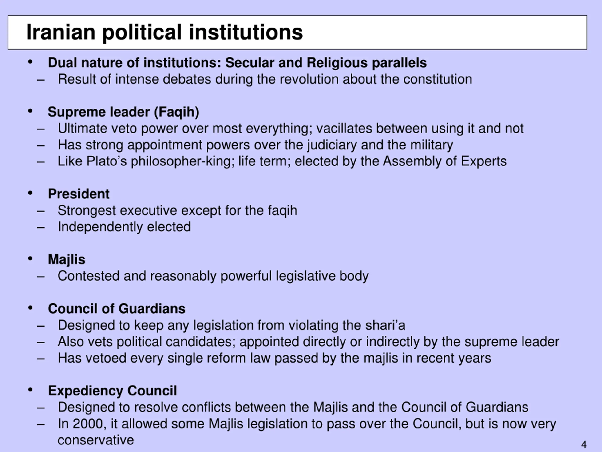 Iranian political institutions Dual nature of institutions: Secular and Religious parallels Result of intense debates during the revolution about the constitution Supreme leader (Faqih) Ultimate veto power over most everything; vacillates between using it and not Has strong appointment powers over the judiciary and the military Like Plato s philosopher-king; life term; elected by the Assembly of Experts President Strongest executive except for the faqih Independently elected Majlis Contested and reasonably powerful legislative body Council of Guardians Designed to keep any legislation from violating the shari a Also vets political candidates; appointed directly or indirectly by the supreme leader Has vetoed every single reform law passed by the majlis in recent years Expediency Council Designed to resolve conflicts between the Majlis and the Council of Guardians In 2000, it allowed some Majlis legislation to pass over the Council, but is now very conservative 4