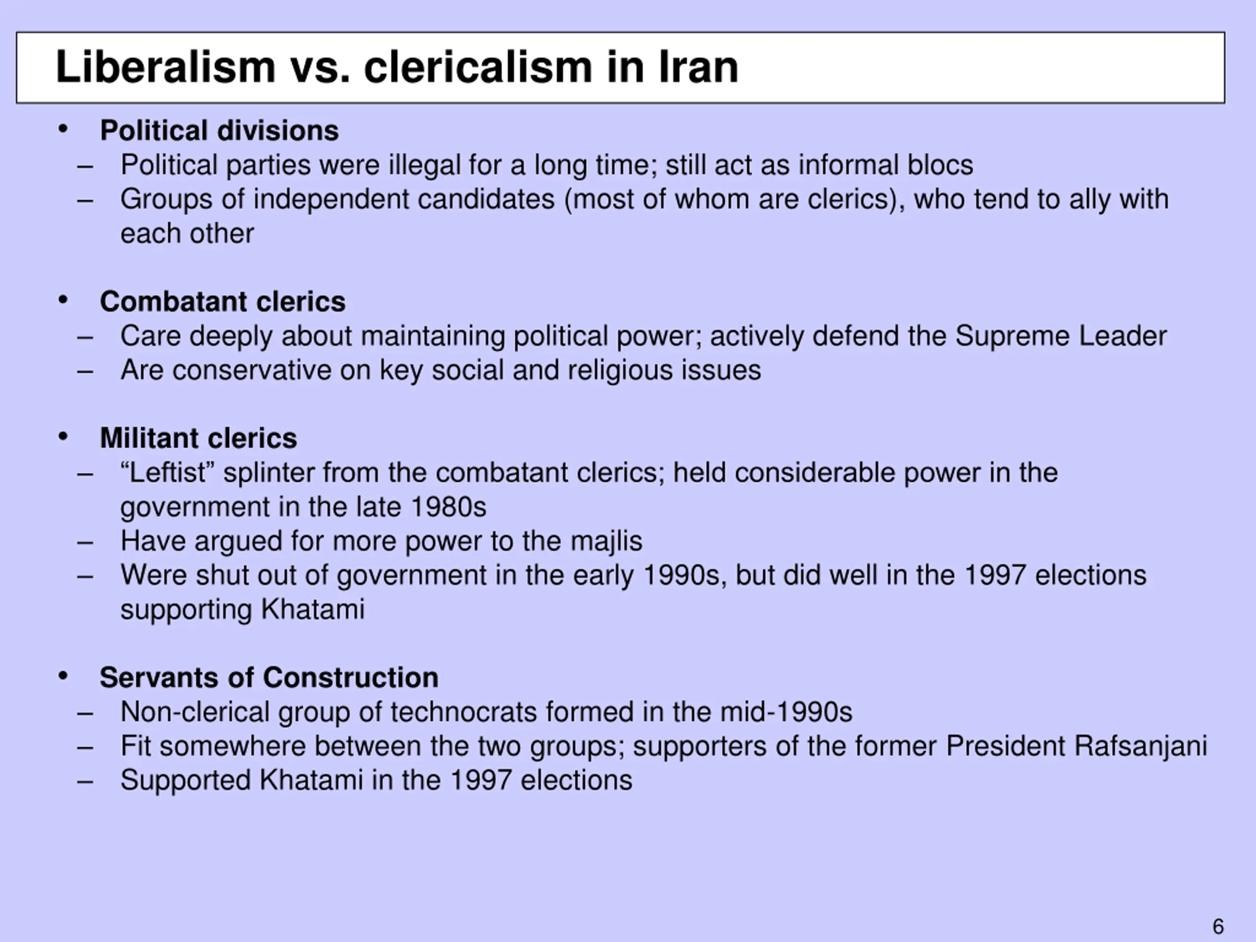 Liberalism vs. clericalism in Iran Political divisions Political parties were illegal for a long time; still act as informal blocs Groups of independent candidates (most of whom are clerics), who tend to ally with each other Combatant clerics Care deeply about maintaining political power; actively defend the Supreme Leader Are conservative on key social and religious issues Militant clerics Leftist splinter from the combatant clerics; held considerable power in the government in the late 1980s Have argued for more power to the majlis Were shut out of government in the early 1990s, but did well in the 1997 elections supporting Khatami Servants of Construction Non-clerical group of technocrats formed in the mid-1990s Fit somewhere between the two groups; supporters of the former President Rafsanjani Supported Khatami in the 1997 elections 6