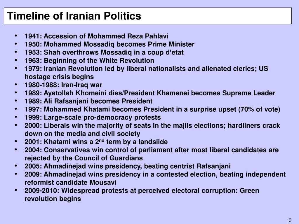 Timeline of Iranian Politics 1941: Accession of Mohammed Reza Pahlavi 1950: Mohammed Mossadiq becomes Prime Minister 1953: Shah overthrows Mossadiq in a coup d etat 1963: Beginning of the White Revolution 1979: Iranian Revolution led by liberal nationalists and alienated clerics; US hostage crisis begins 1980-1988: Iran-Iraq war 1989: Ayatollah Khomeini dies/President Khamenei becomes Supreme Leader 1989: Ali Rafsanjani becomes President 1997: Mohammed Khatami becomes President in a surprise upset (70% of vote) 1999: Large-scale pro-democracy protests 2000: Liberals win the majority of seats in the majlis elections; hardliners crack down on the media and civil society 2001: Khatami wins a 2nd term by a landslide 2004: Conservatives win control of parliament after most liberal candidates are rejected by the Council of Guardians 2005: Ahmadinejad wins presidency, beating centrist Rafsanjani 2009: Ahmadinejad wins presidency in a contested election, beating independent reformist candidate Mousavi 2009-2010: Widespread protests at perceived electoral corruption: Green revolution begins 0
