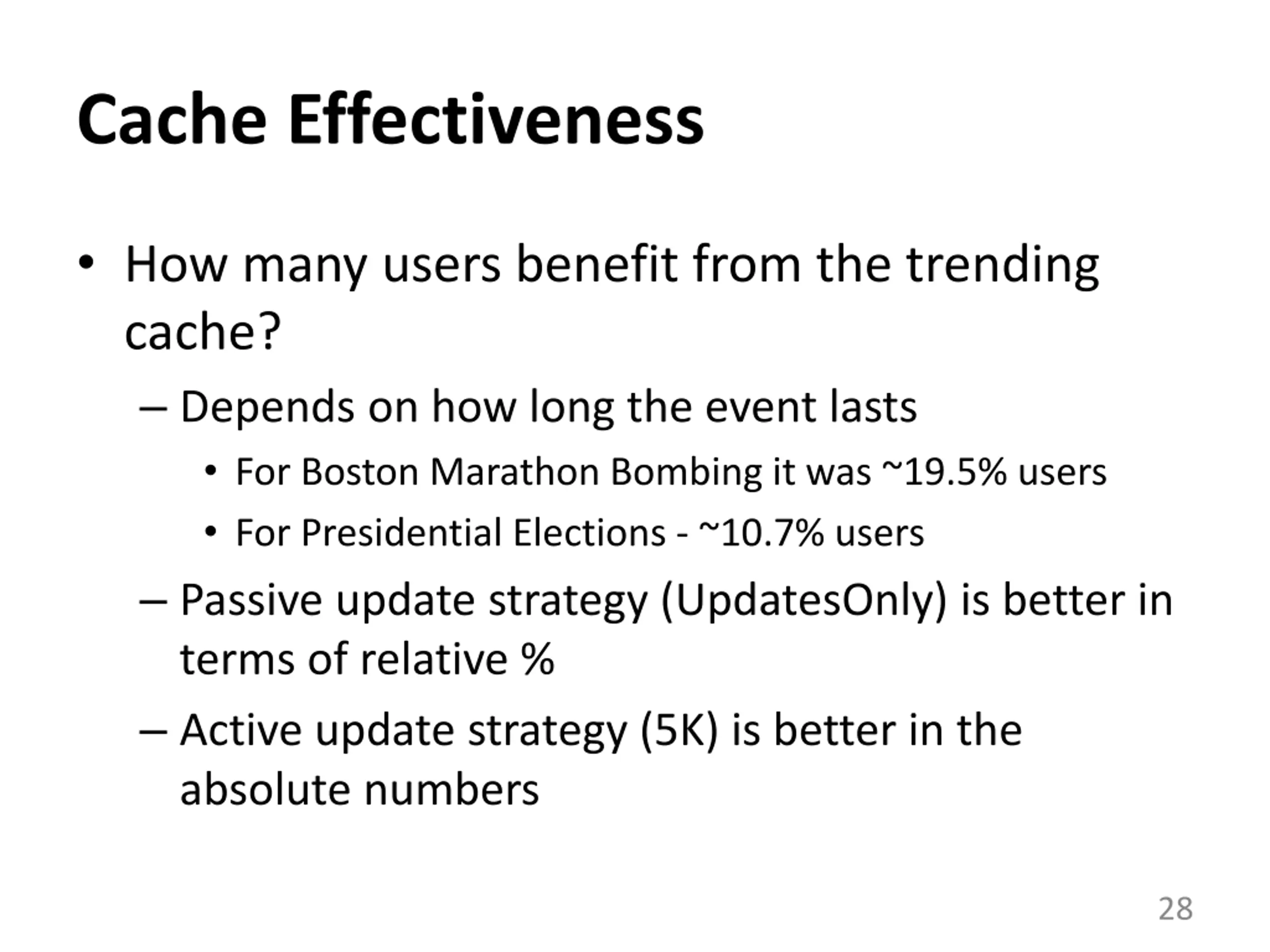 Cache Effectiveness How many users benefit from the trending cache? Depends on how long the event lasts For Boston Marathon Bombing it was ~19.5% users For Presidential Elections - ~10.7% users Passive update strategy (UpdatesOnly) is better in terms of relative % Active update strategy (5K) is better in the absolute numbers 28