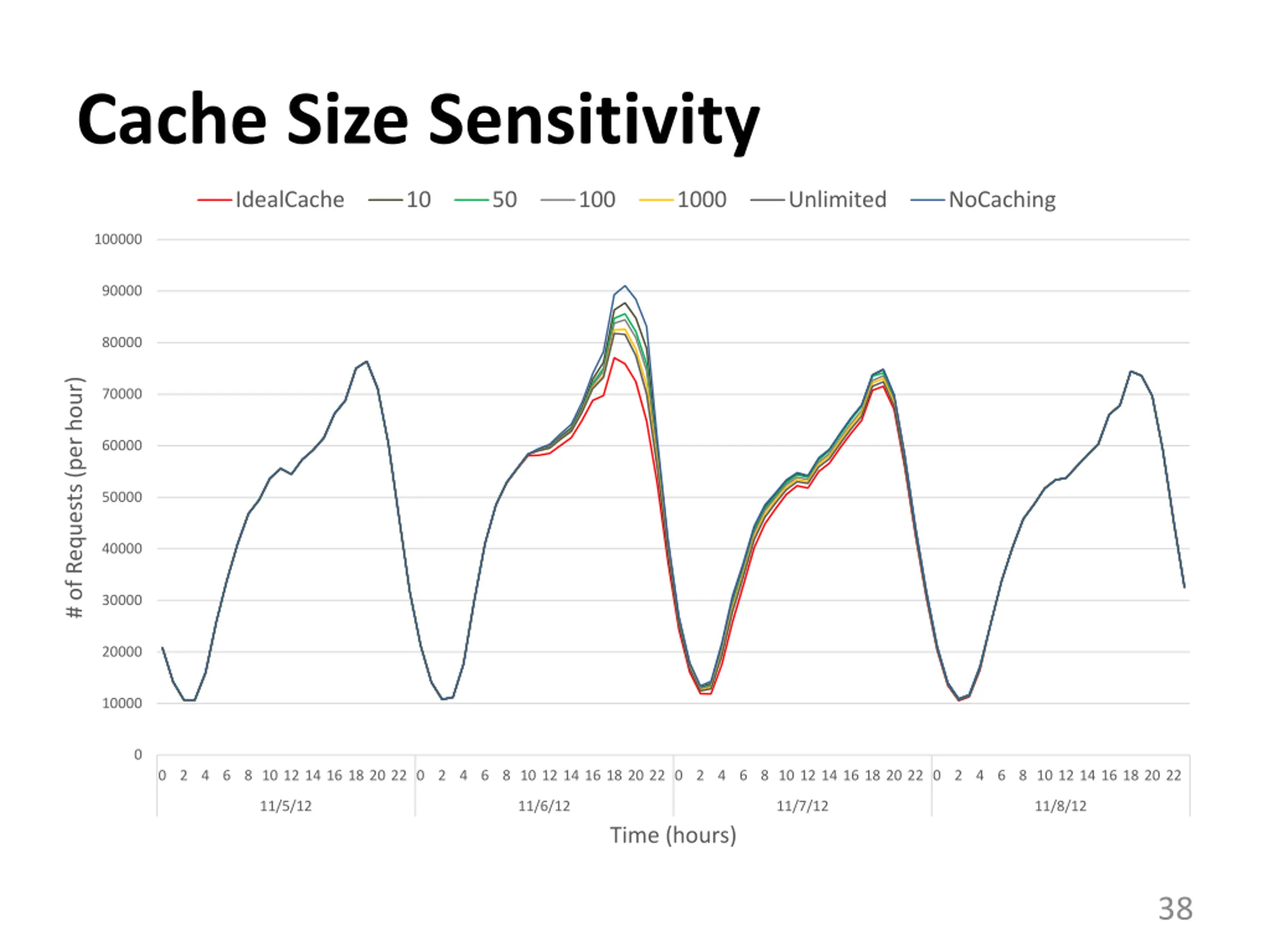Cache Size Sensitivity IdealCache 10 50 100 1000 Unlimited NoCaching 100000 90000 80000 # of Requests (per hour) 70000 60000 50000 40000 30000 20000 10000 0 0 2 4 6 8 10 12 14 16 18 20 22 0 2 4 6 8 10 12 14 16 18 20 22 0 2 4 6 8 10 12 14 16 18 20 22 0 2 4 6 8 10 12 14 16 18 20 22 11/5/12 11/6/12 11/7/12 11/8/12 Time (hours) 38