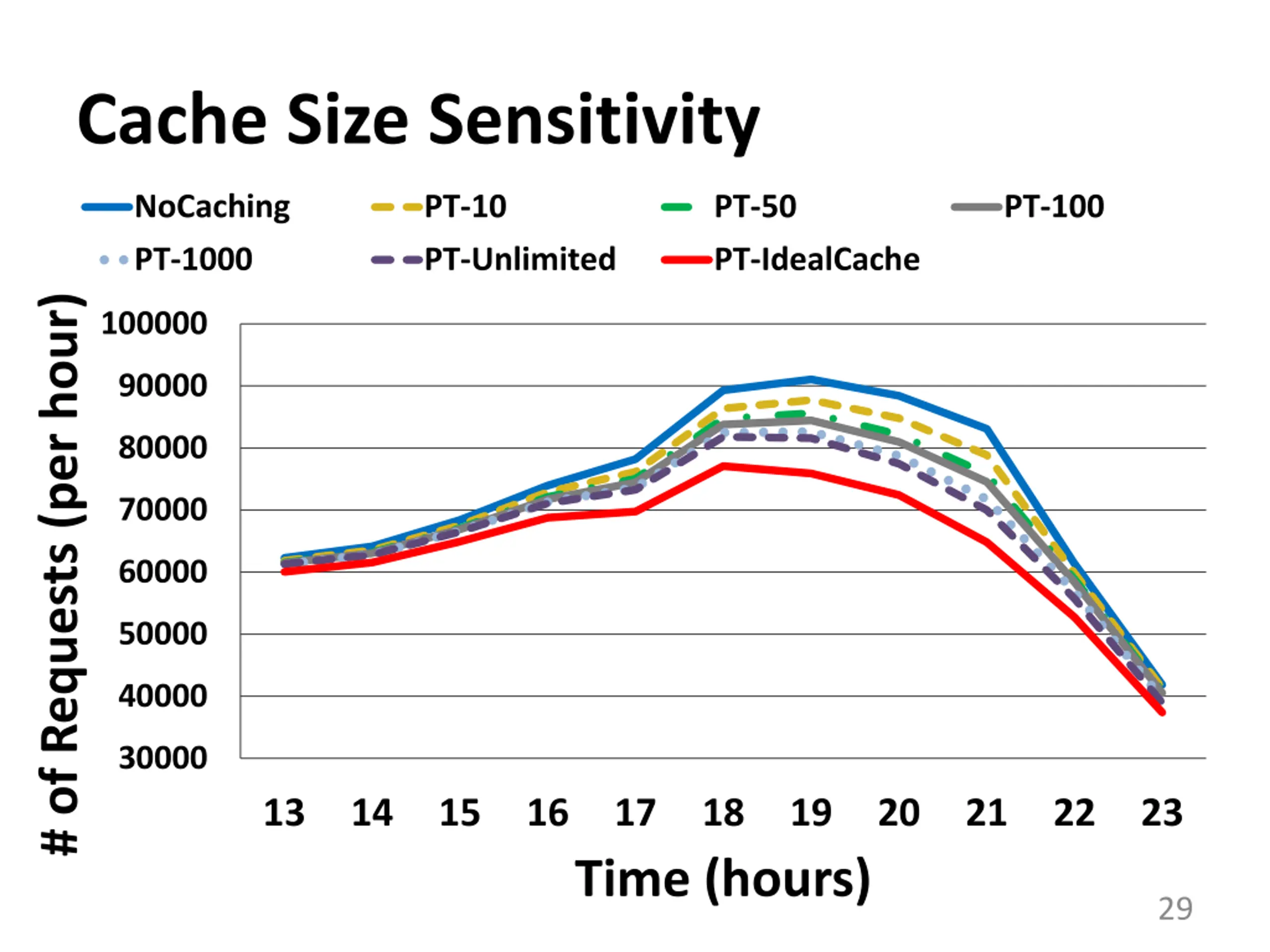 Cache Size Sensitivity NoCaching PT-1000 PT-10 PT-Unlimited PT-50 PT-IdealCache PT-100 # of Requests (per hour) 100000 90000 80000 70000 60000 50000 40000 30000 13 14 15 16 17 18 19 20 21 22 23 Time (hours) 29