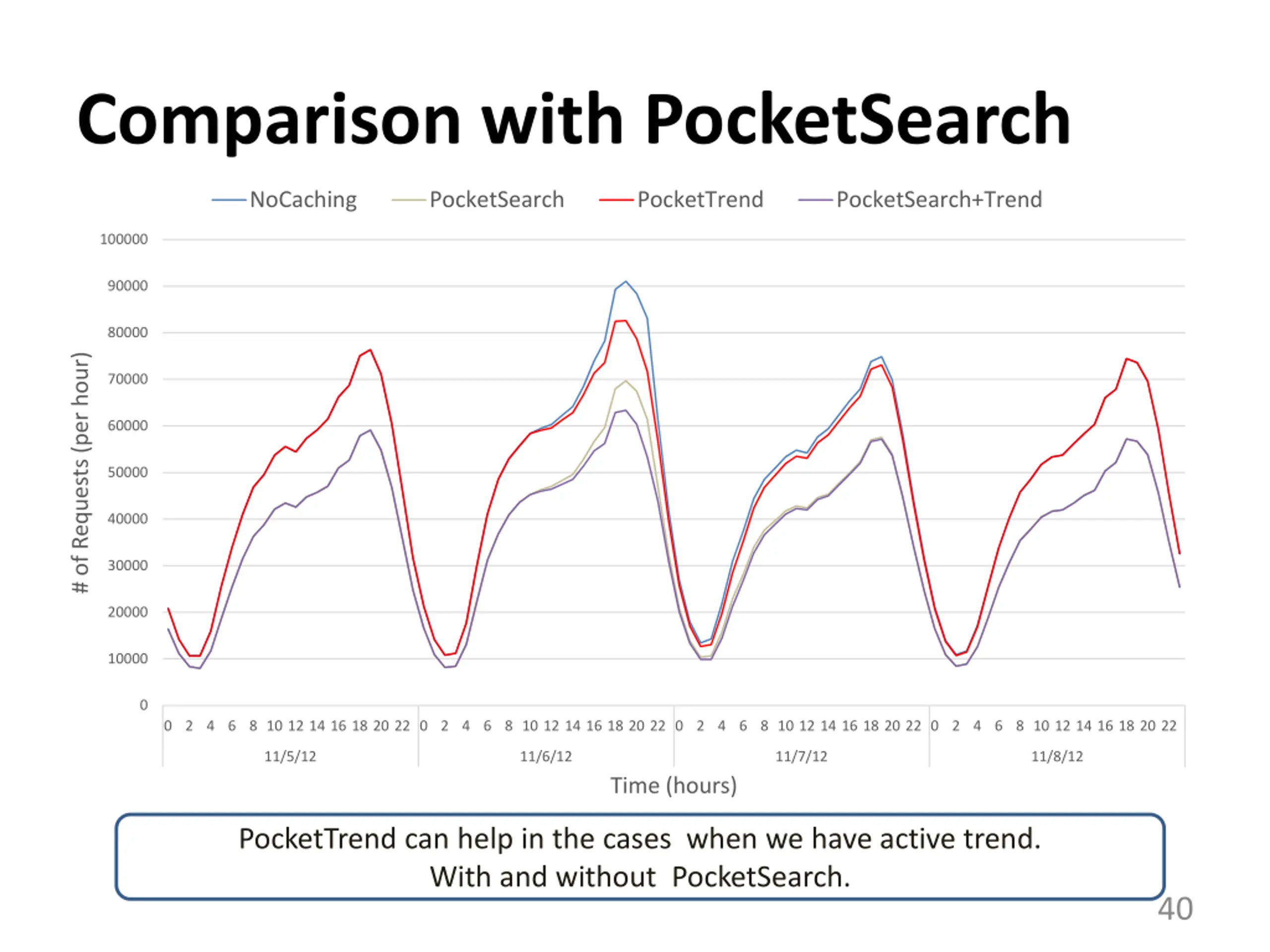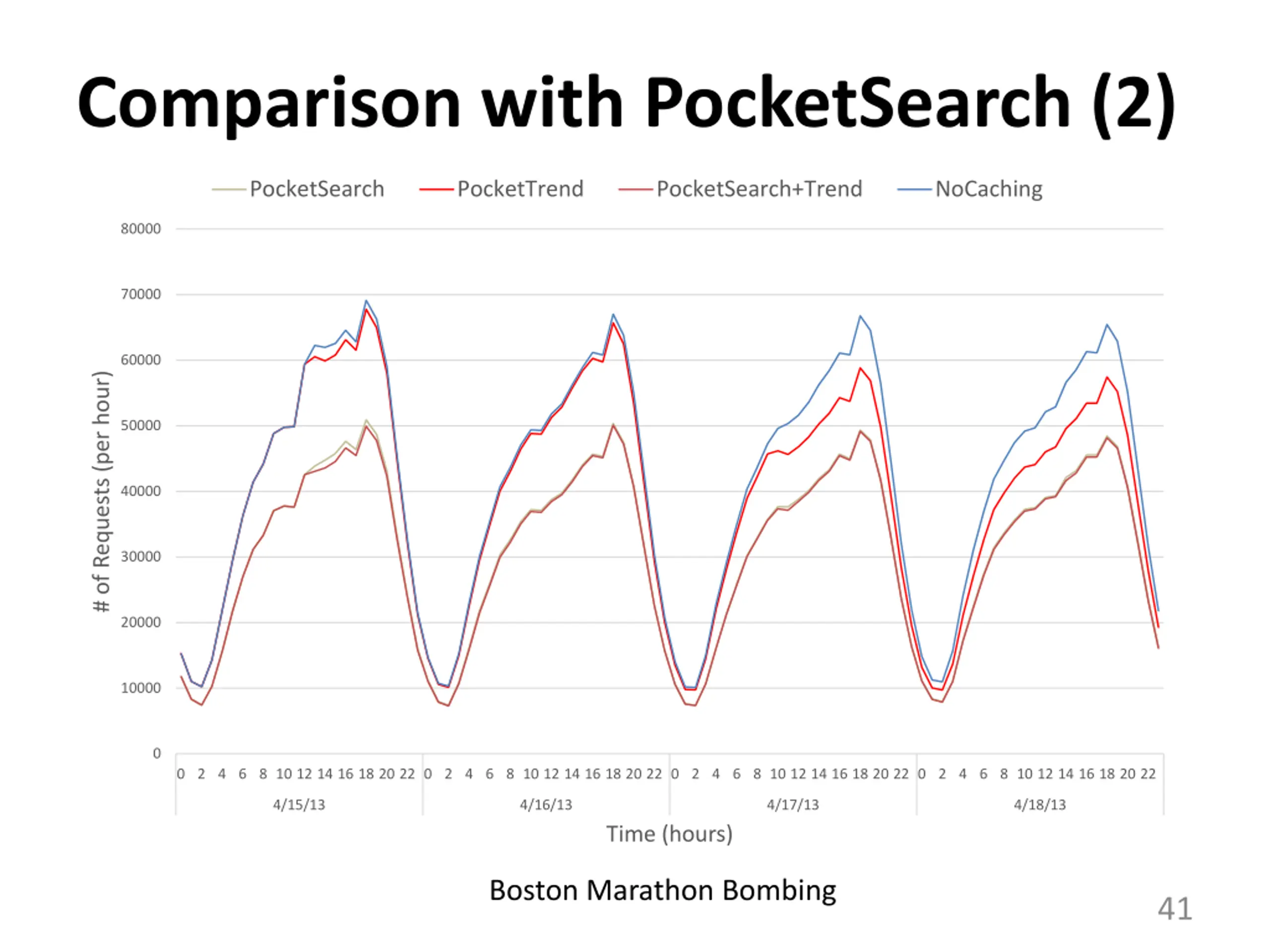 Comparison with PocketSearch NoCaching PocketSearch PocketTrend PocketSearch+Trend 100000 90000 80000 # of Requests (per hour) 70000 60000 50000 40000 30000 20000 10000 0 0 2 4 6 8 10 12 14 16 18 20 22 0 2 4 6 8 10 12 14 16 18 20 22 0 2 4 6 8 10 12 14 16 18 20 22 0 2 4 6 8 10 12 14 16 18 20 22 11/5/12 11/6/12 11/7/12 11/8/12 Time (hours) PocketTrend can help in the cases when we have active trend. With and without PocketSearch. 40