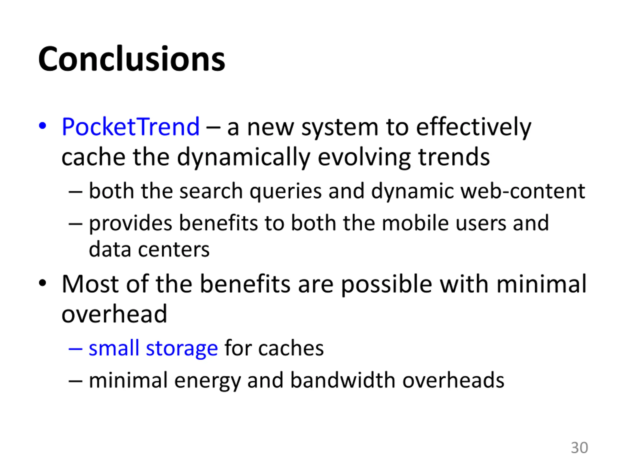 Conclusions PocketTrend a new system to effectively cache the dynamically evolving trends both the search queries and dynamic web-content provides benefits to both the mobile users and data centers Most of the benefits are possible with minimal overhead small storage for caches minimal energy and bandwidth overheads 30