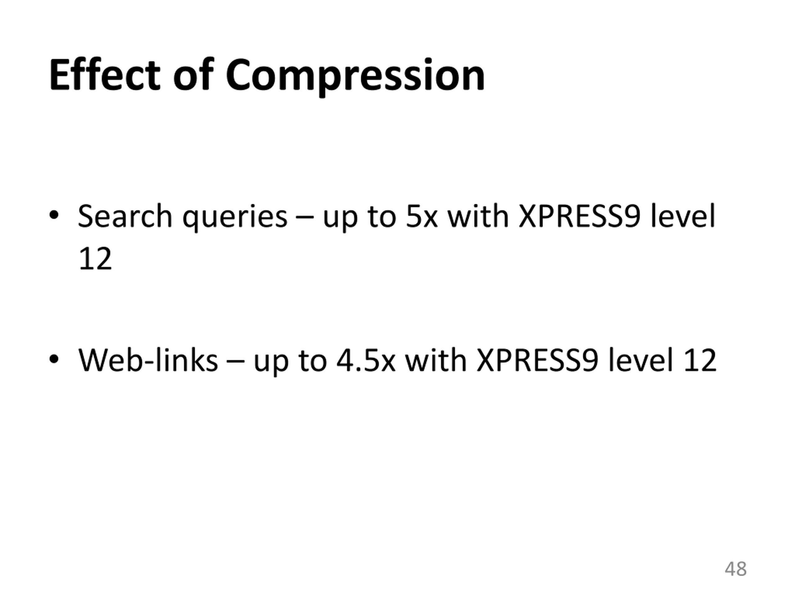 Effect of Compression Search queries up to 5x with XPRESS9 level 12 Web-links up to 4.5x with XPRESS9 level 12 48