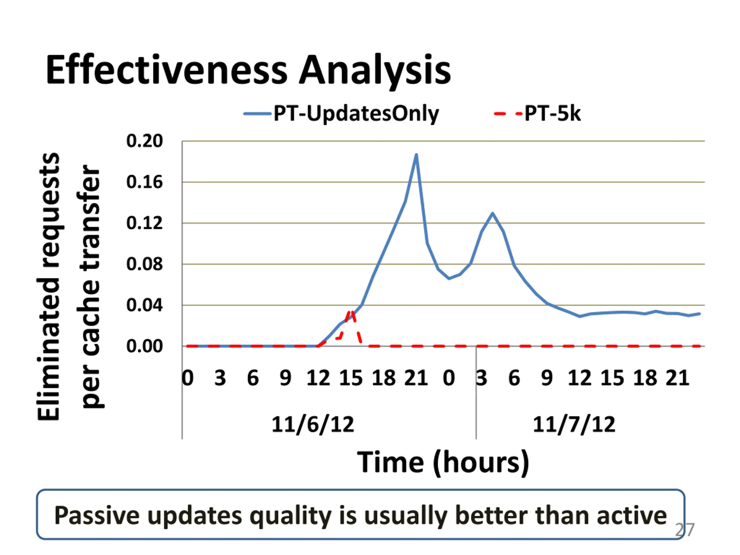 Effectiveness Analysis PT-UpdatesOnly PT-5k 0.20 Eliminated requests per cache transfer 0.16 0.12 0.08 0.04 0.00 0 3 6 9 12 15 18 21 0 3 6 9 12 15 18 21 11/6/12 11/7/12 Time (hours) Passive updates quality is usually better than active 27