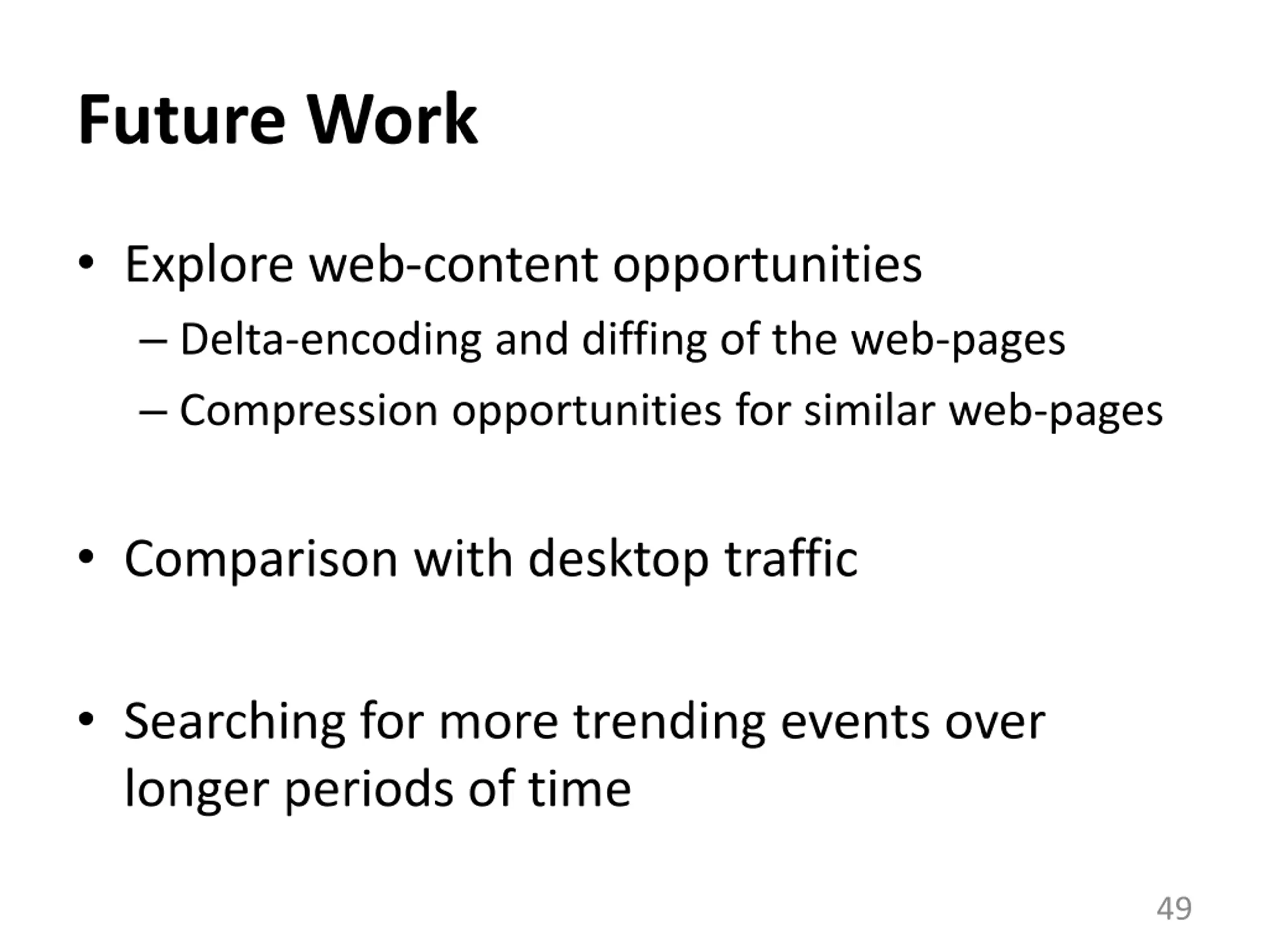 Future Work Explore web-content opportunities Delta-encoding and diffing of the web-pages Compression opportunities for similar web-pages Comparison with desktop traffic Searching for more trending events over longer periods of time 49