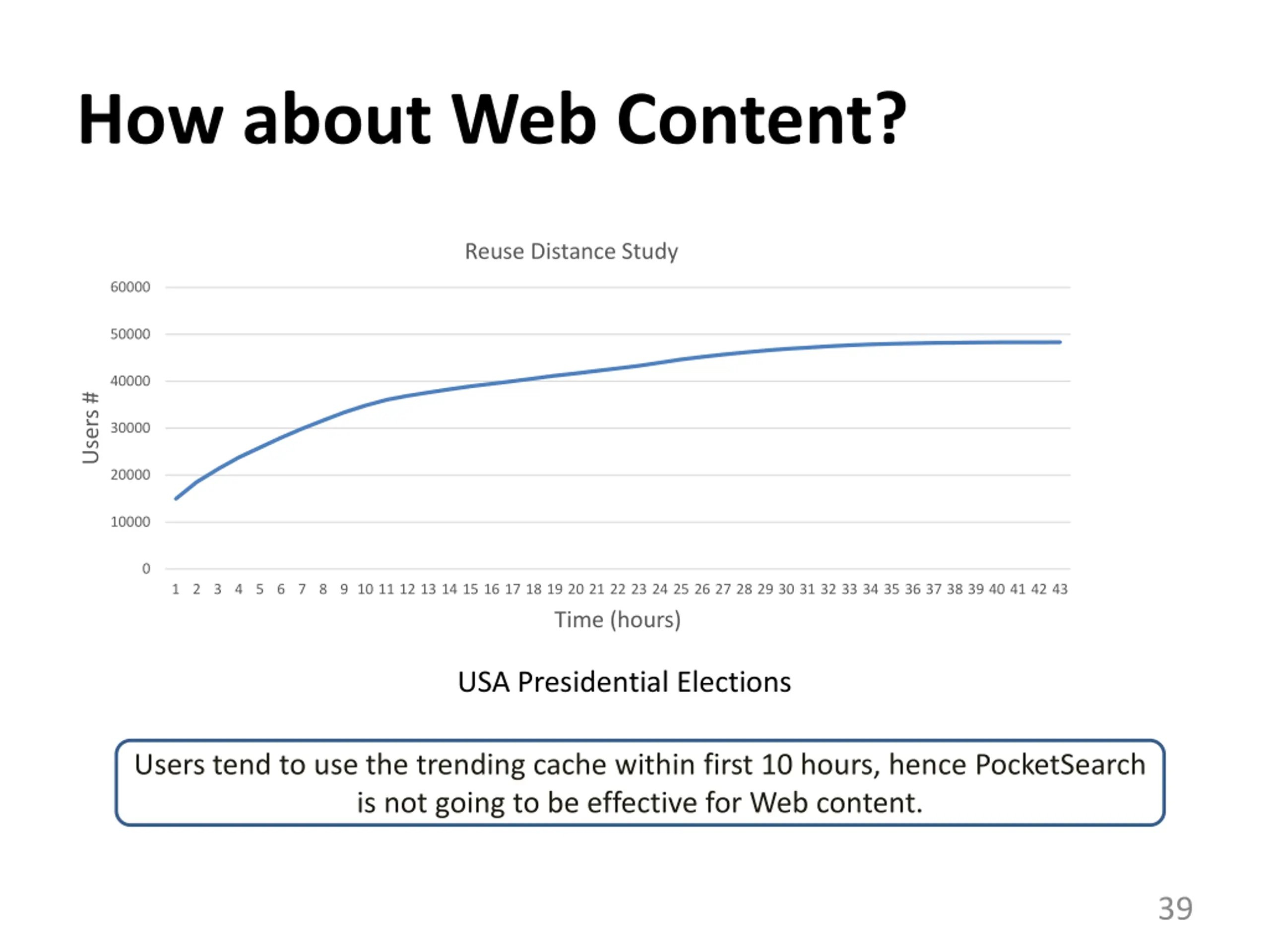 How about Web Content? Reuse Distance Study 60000 50000 40000 Users # 30000 20000 10000 0 1 2 3 4 5 6 7 8 9 10 11 12 13 14 15 16 17 18 19 20 21 22 23 24 25 26 27 28 29 30 31 32 33 34 35 36 37 38 39 40 41 42 43 Time (hours) USA Presidential Elections Users tend to use the trending cache within first 10 hours, hence PocketSearch is not going to be effective for Web content. 39