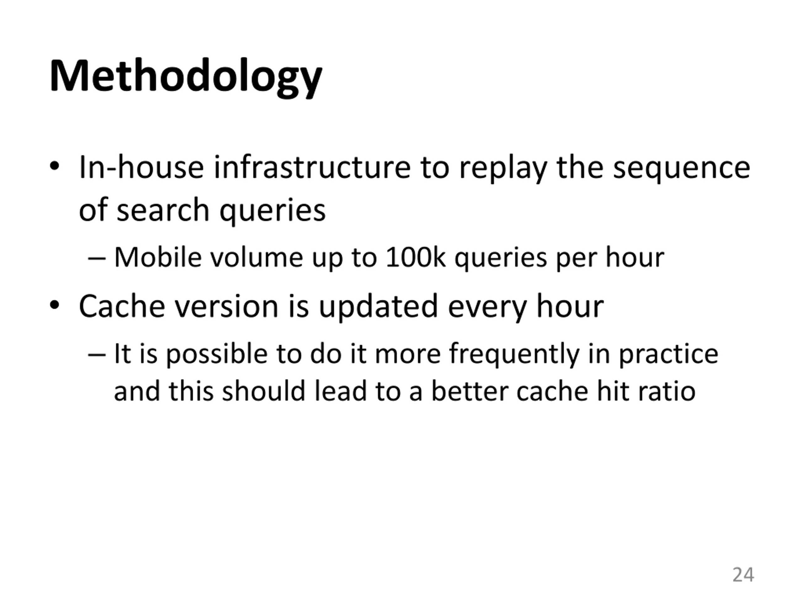 Methodology In-house infrastructure to replay the sequence of search queries Mobile volume up to 100k queries per hour Cache version is updated every hour It is possible to do it more frequently in practice and this should lead to a better cache hit ratio 24