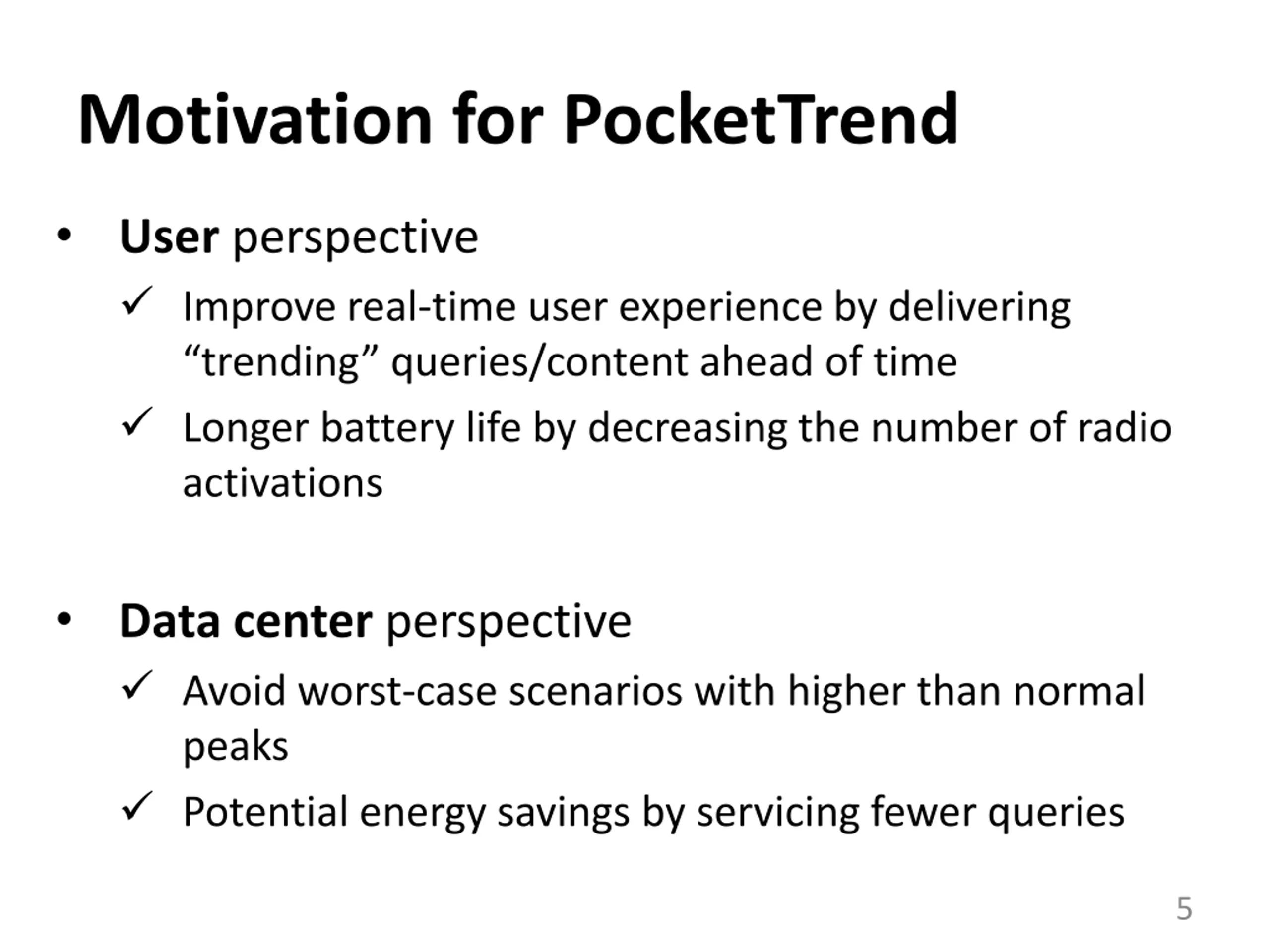 PocketTrend: Timely Identification and Delivery of Trending Search Content to Mobile Users Gennady Pekhimenko, Karin Strauss, Dimitrios Lymberopoulos, Oriana Riva, Doug Burger