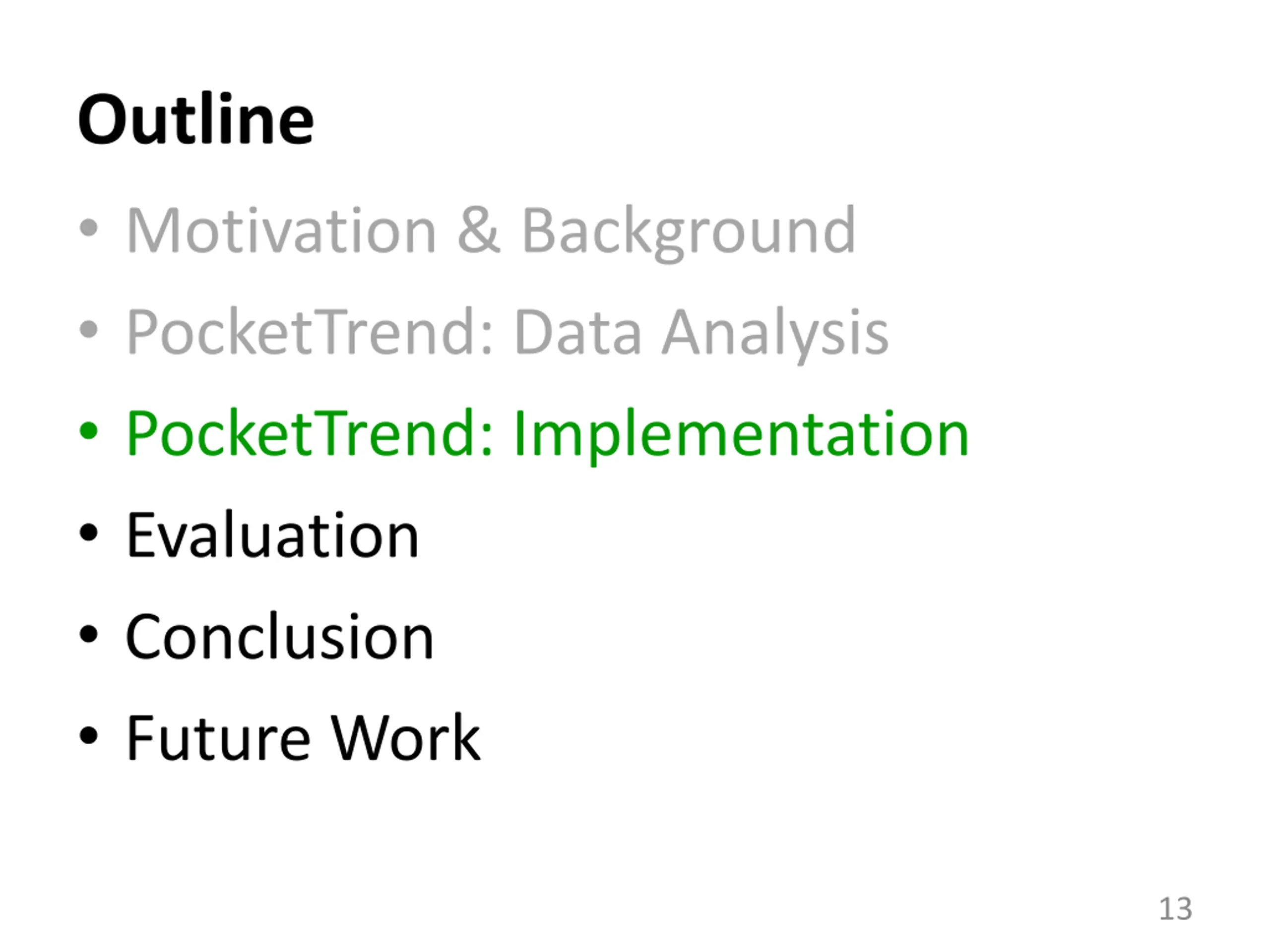 Outline Motivation & Background PocketTrend: Data Analysis PocketTrend: Implementation Evaluation Conclusion Future Work 13