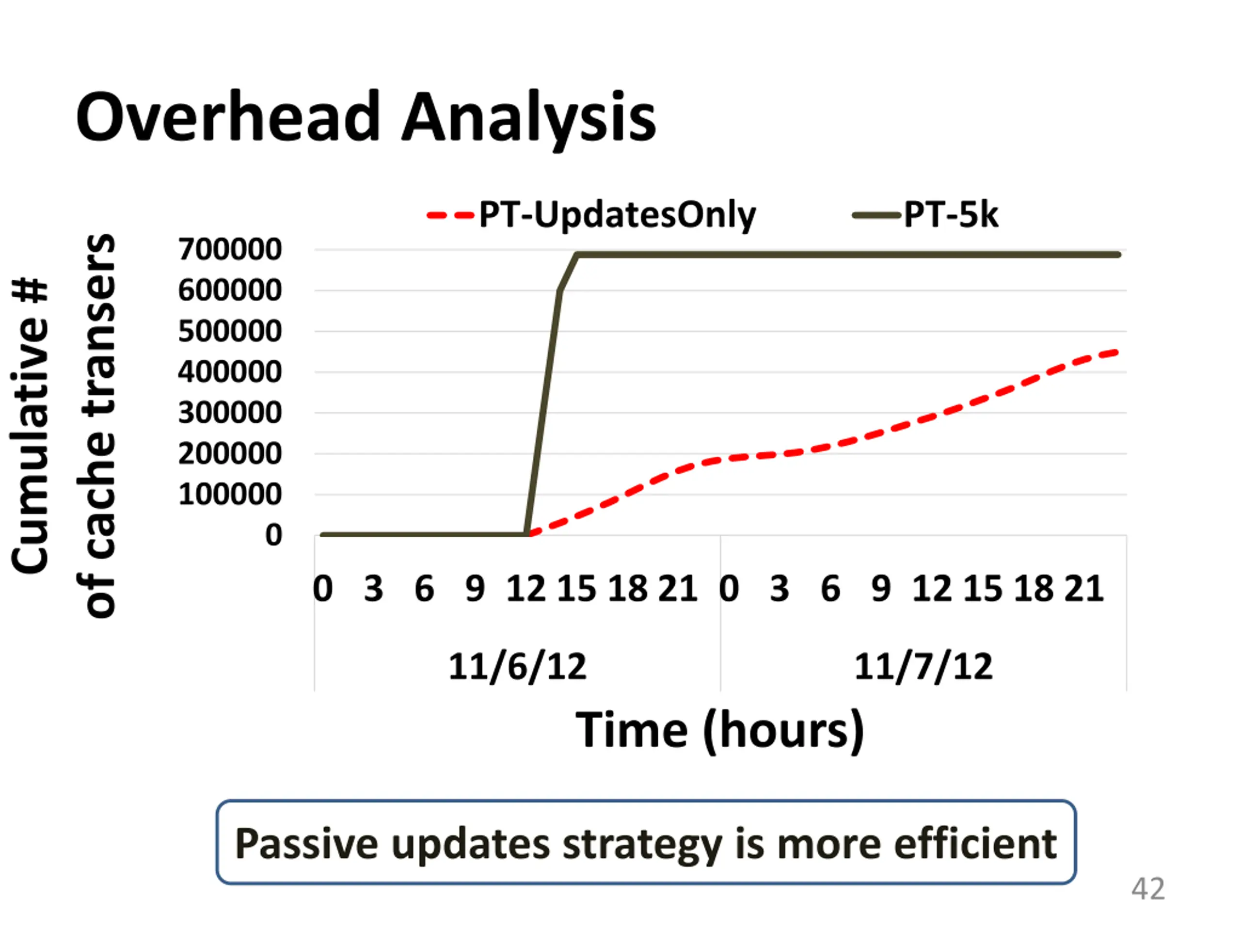 Overhead Analysis PT-UpdatesOnly PT-5k of cache transers 700000 Cumulative # 600000 500000 400000 300000 200000 100000 0 0 3 6 9 12 15 18 21 0 3 6 9 12 15 18 21 11/6/12 11/7/12 Time (hours) Passive updates strategy is more efficient 42