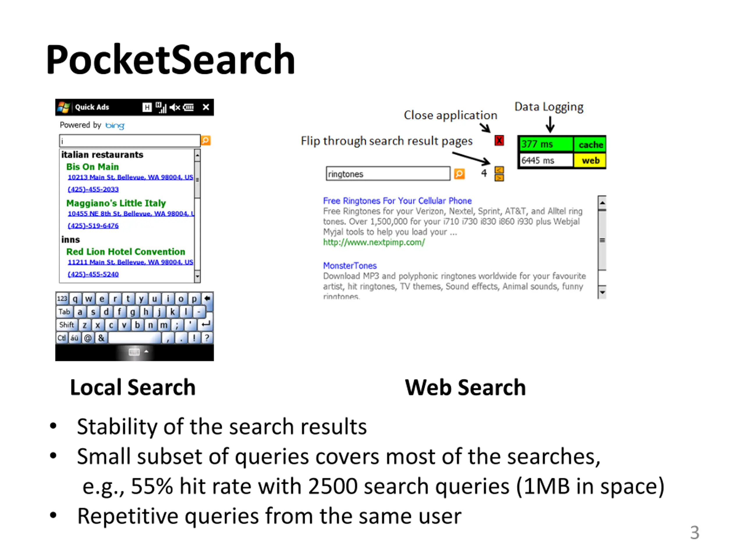 PocketSearch Local Search Web Search Stability of the search results Small subset of queries covers most of the searches, e.g., 55% hit rate with 2500 search queries (1MB in space) Repetitive queries from the same user 3