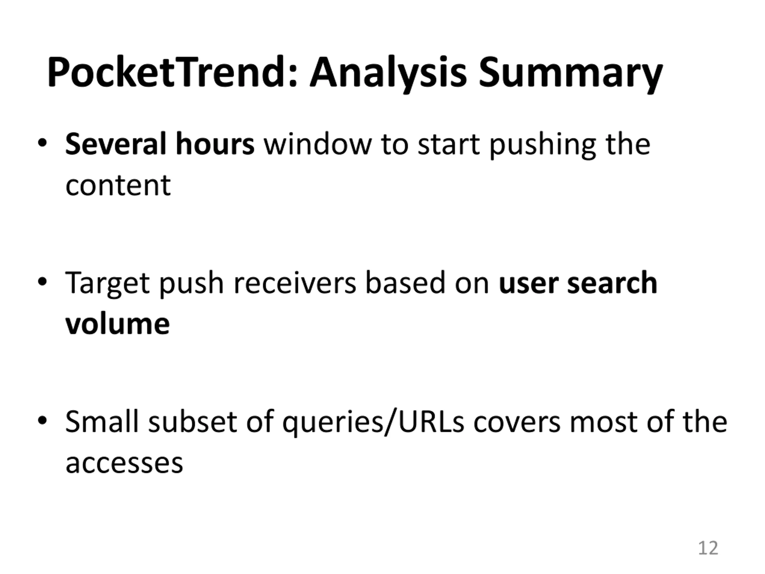 PocketTrend: Analysis Summary Several hours window to start pushing the content Target push receivers based on user search volume Small subset of queries/URLs covers most of the accesses 12
