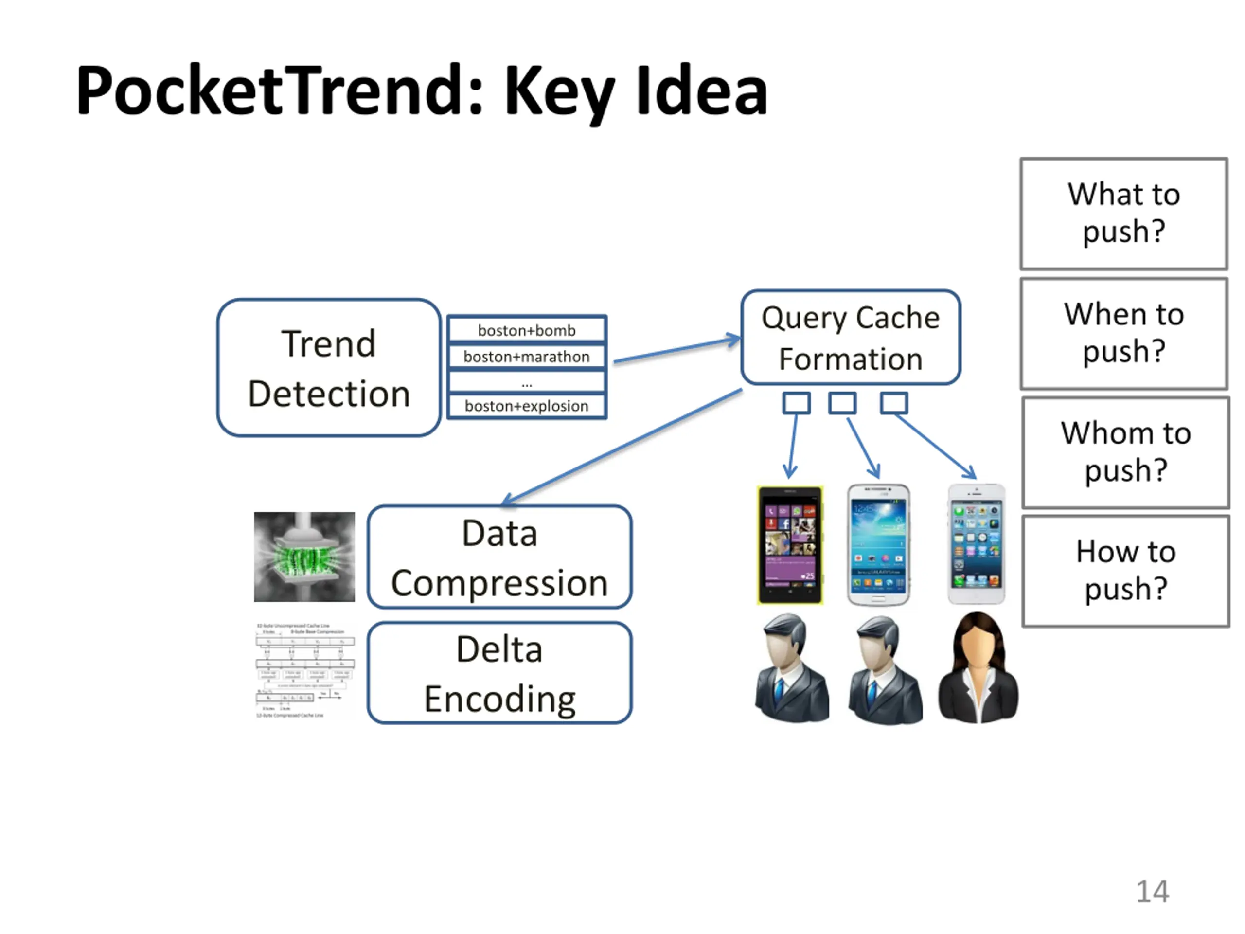 PocketTrend: Key Idea What to push? When to push? Query Cache Formation boston+bomb boston+marathon boston+explosion Trend Detection Whom to push? Data How to push? Compression Delta Encoding 14