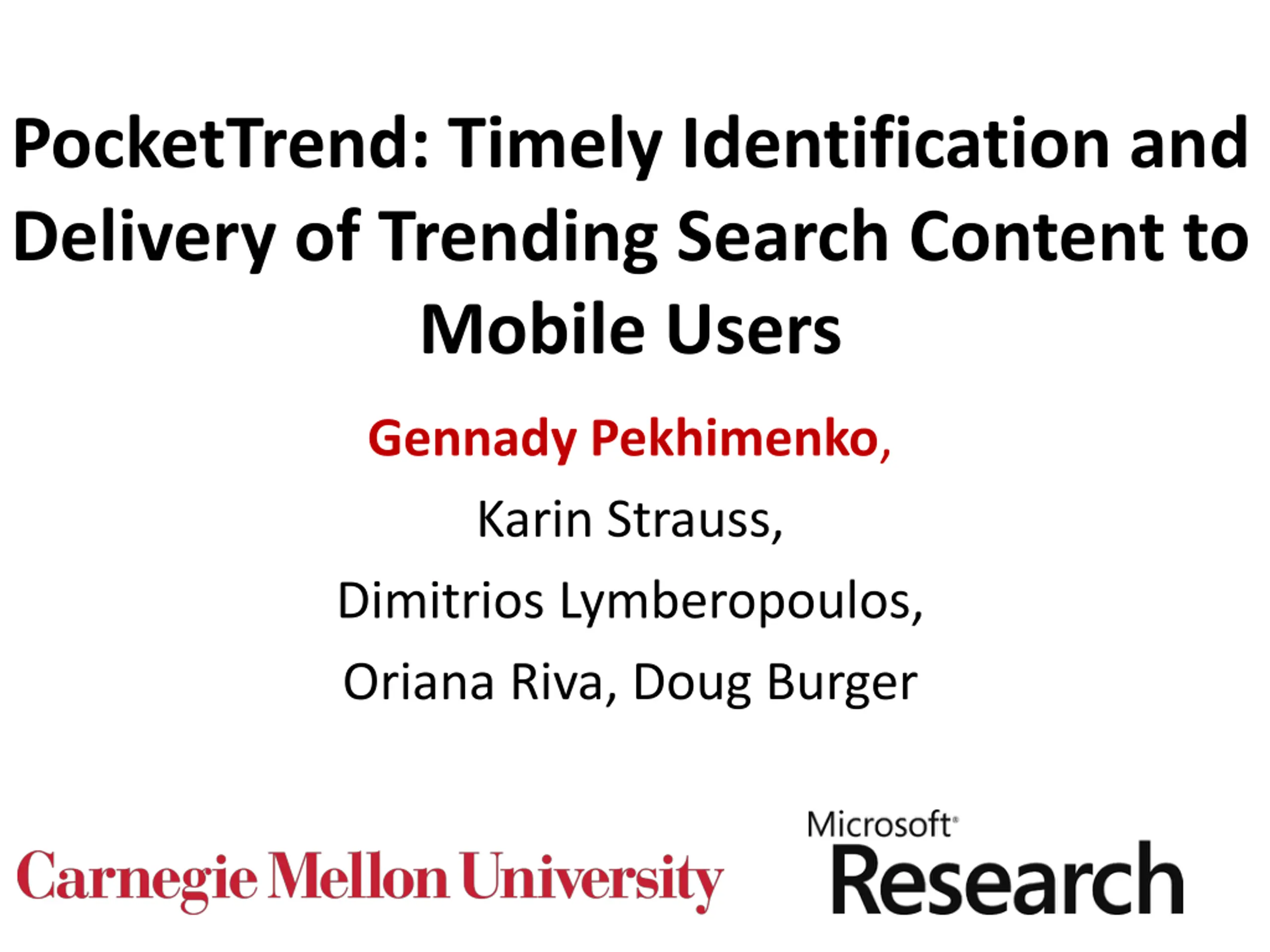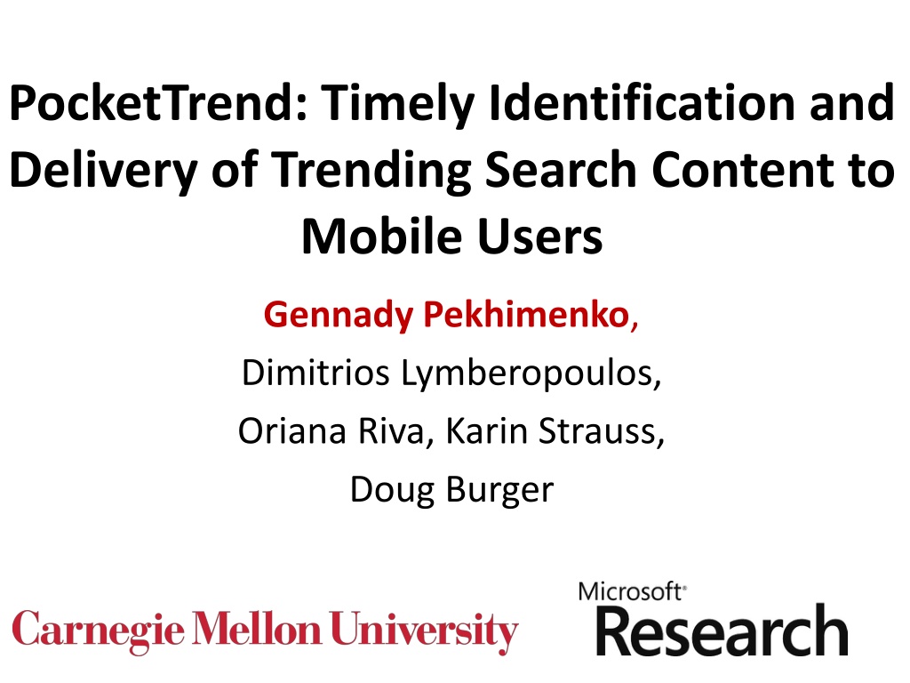 PocketTrend: Timely Identification and Delivery of Trending Search Content to Mobile Users Gennady Pekhimenko, Dimitrios Lymberopoulos, Oriana Riva, Karin Strauss, Doug Burger