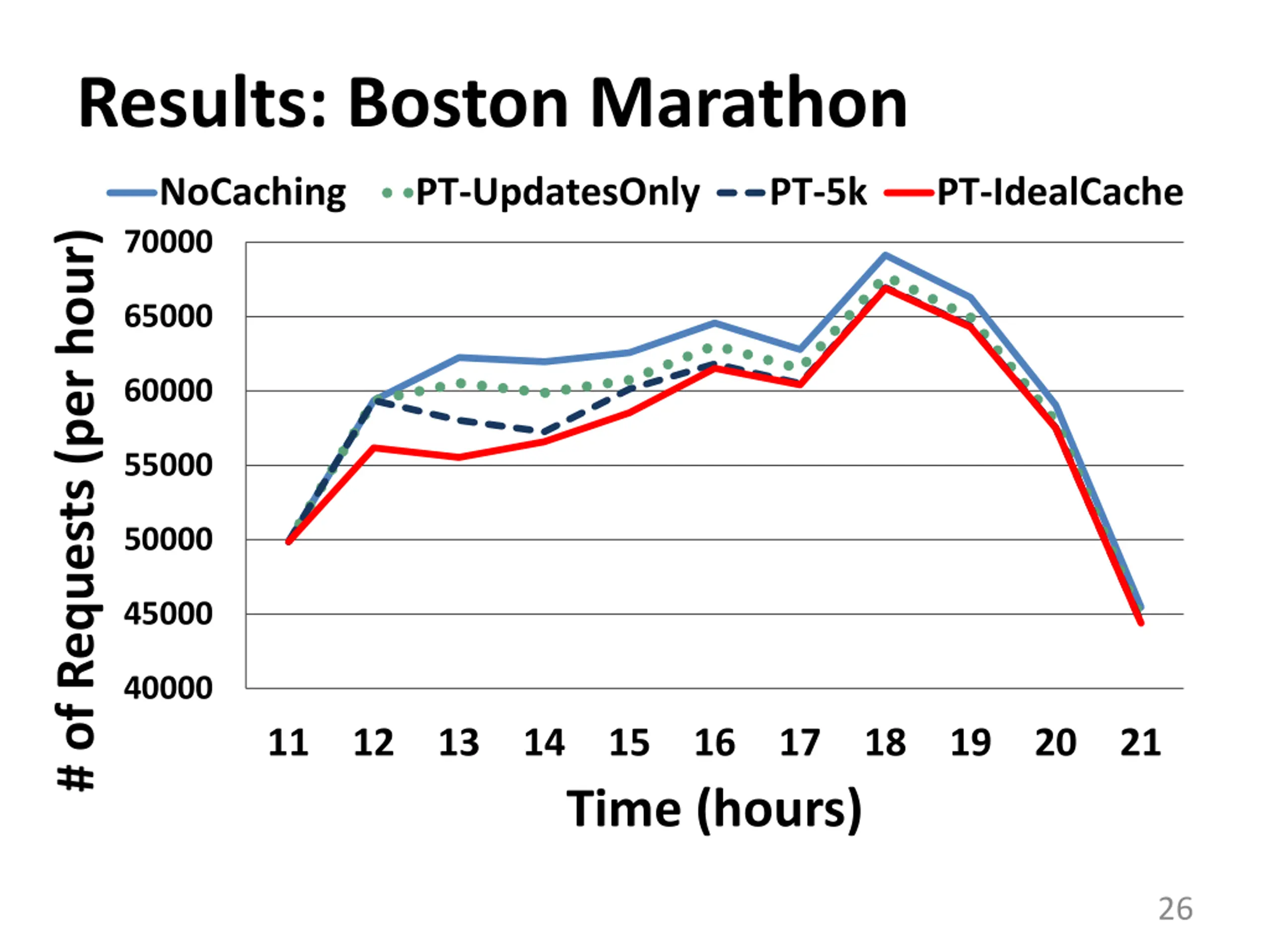 Results: Boston Marathon NoCaching PT-UpdatesOnly PT-5k PT-IdealCache 70000 # of Requests (per hour) 65000 60000 55000 50000 45000 40000 11 12 13 14 15 16 17 18 19 20 21 Time (hours) 26