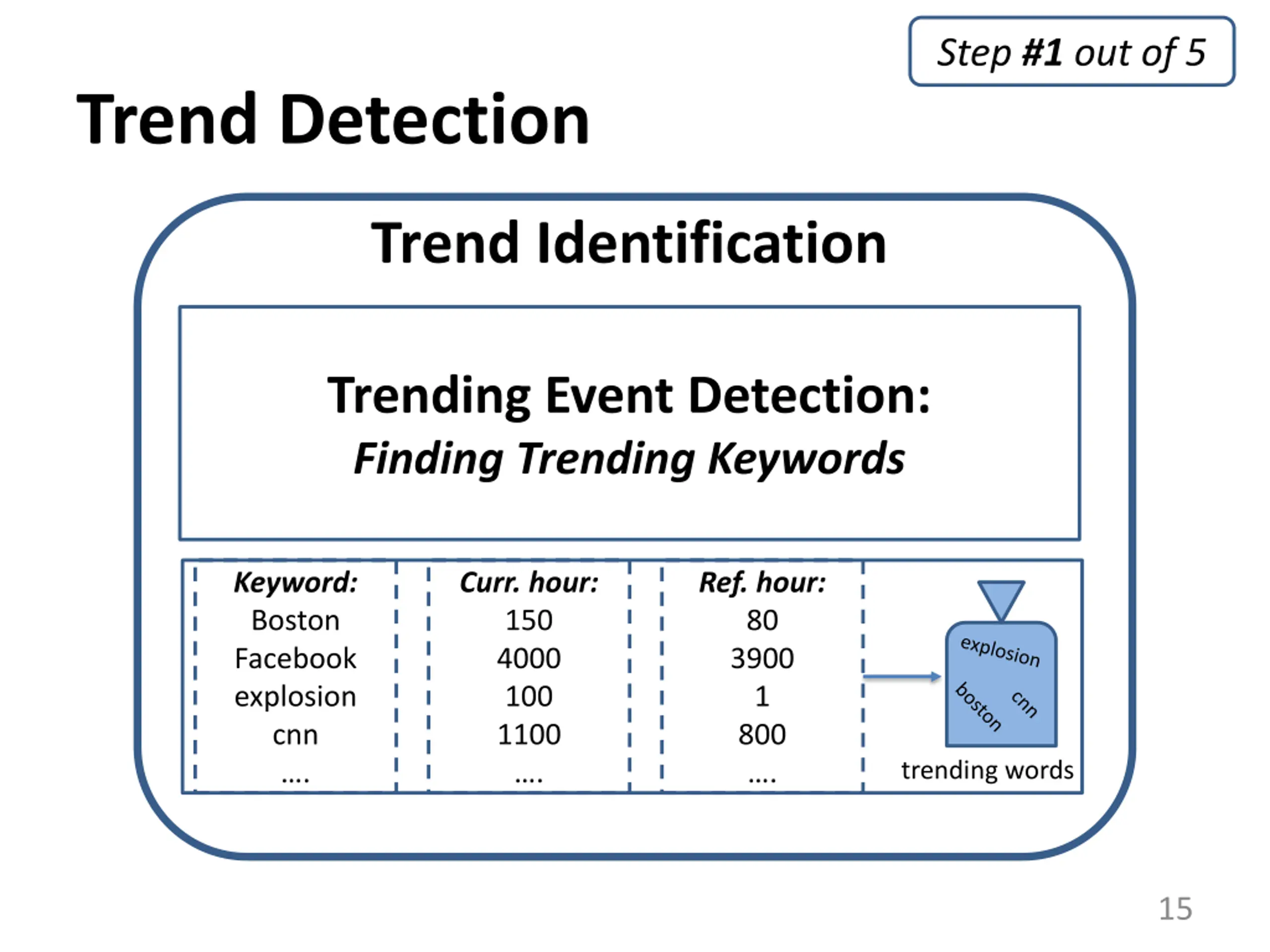 Step #1 out of 5 Trend Detection Trend Identification Trending Event Detection: Finding Trending Keywords Keyword: Boston Facebook explosion cnn . Curr. hour: 150 4000 100 1100 . Ref. hour: 80 3900 1 800 . trending words 15