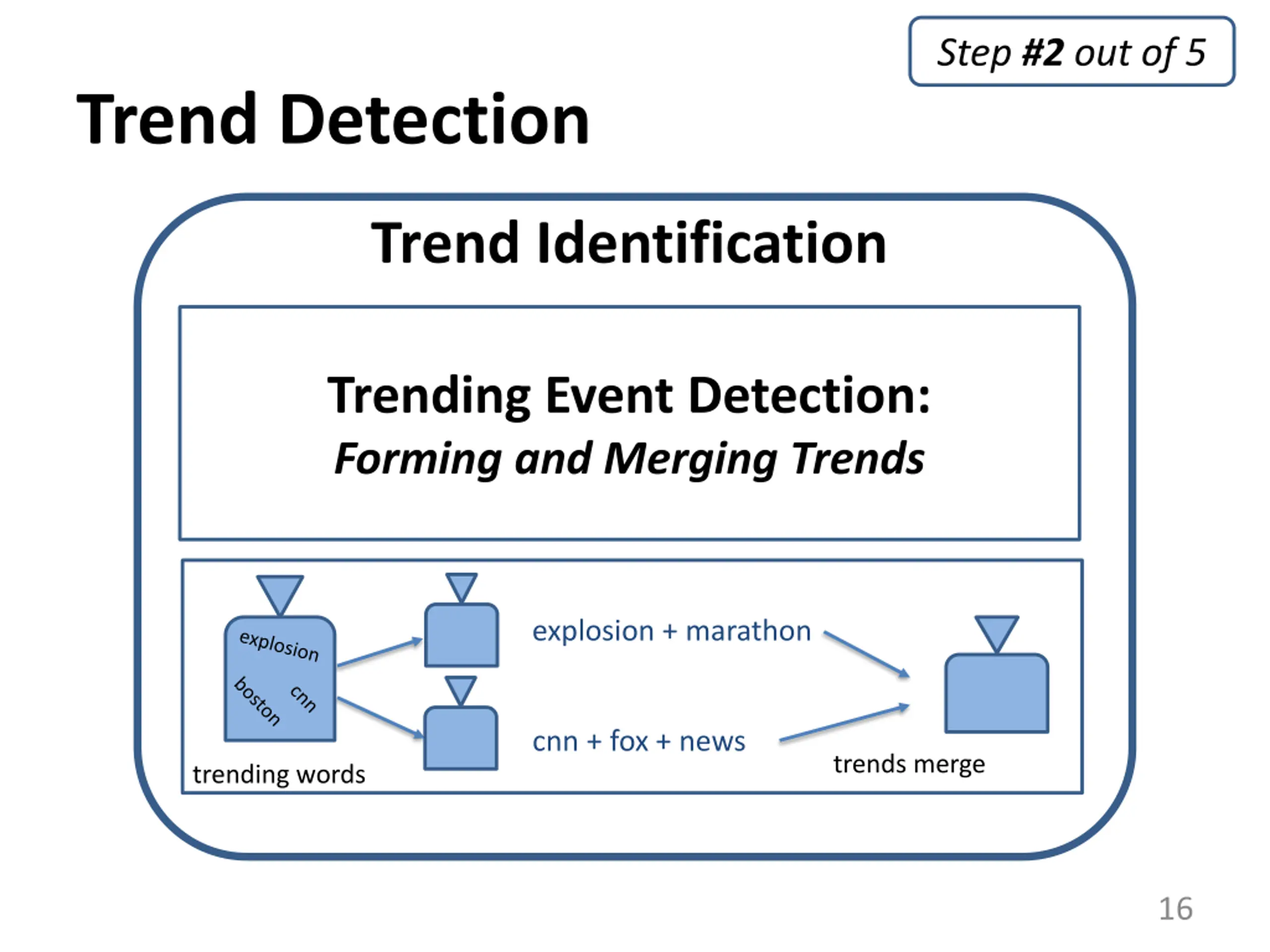 Step #2 out of 5 Trend Detection Trend Identification Trending Event Detection: Forming and Merging Trends explosion + marathon cnn + fox + news trends merge trending words 16