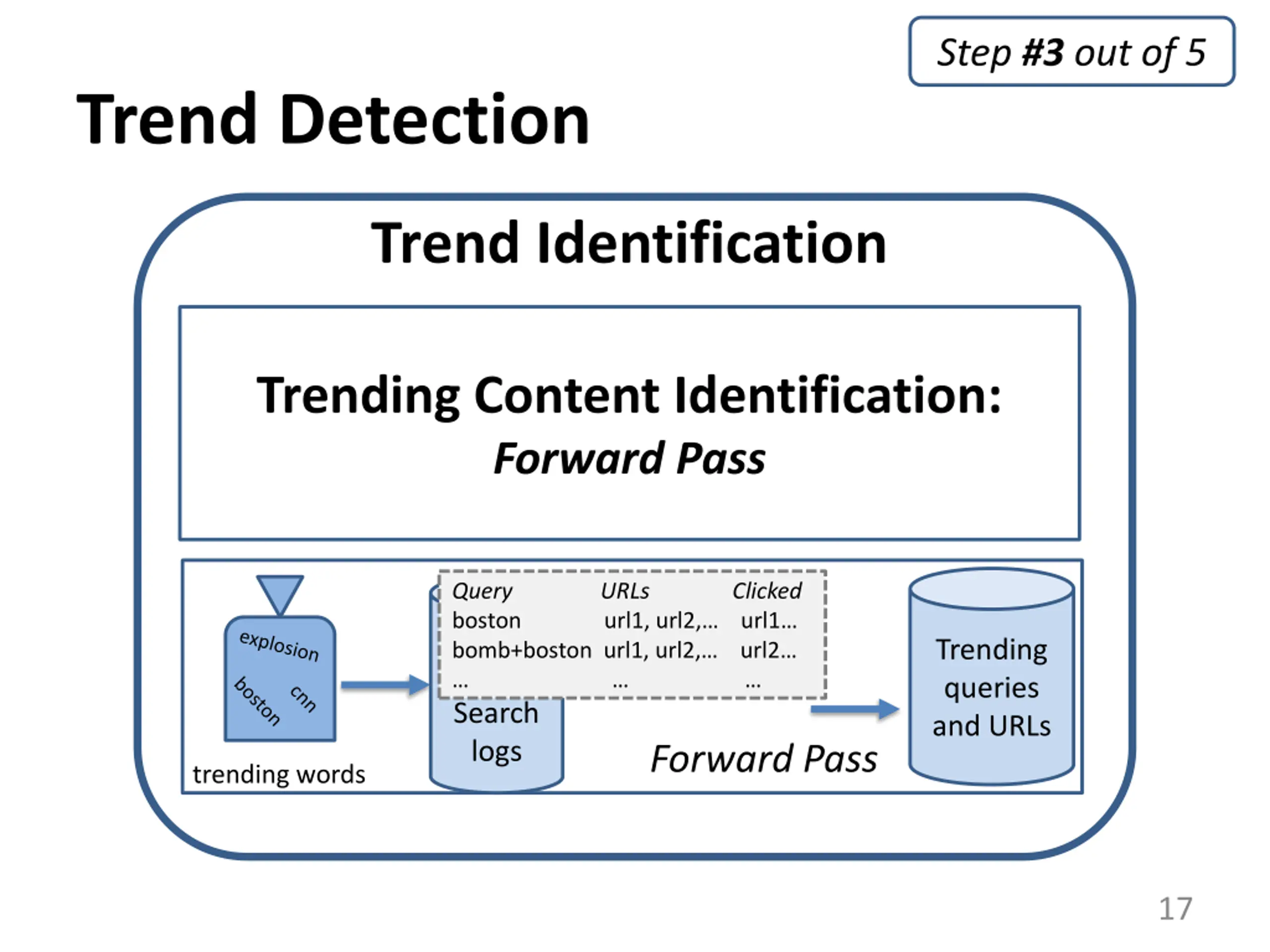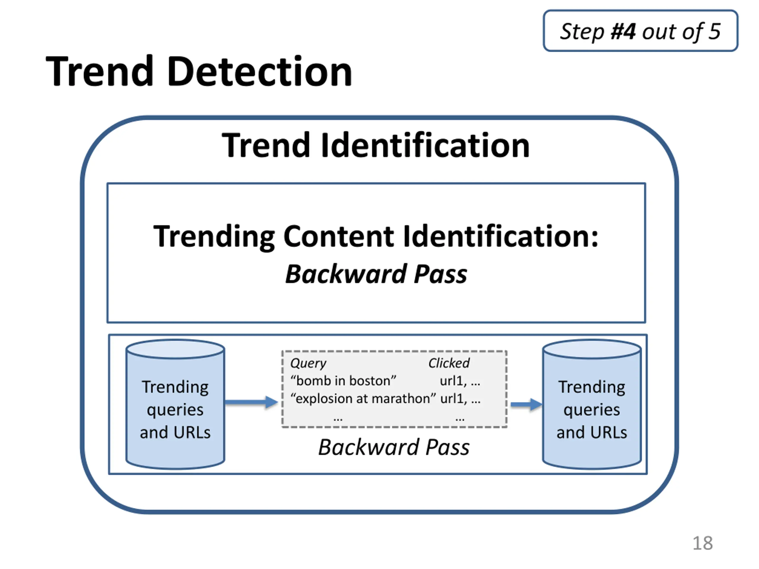 Step #3 out of 5 Trend Detection Trend Identification Trending Content Identification: Forward Pass Query URLs Clicked boston url1, url2, url1 bomb+boston url1, url2, url2 Trending queries and URLs Search logs Forward Pass trending words 17