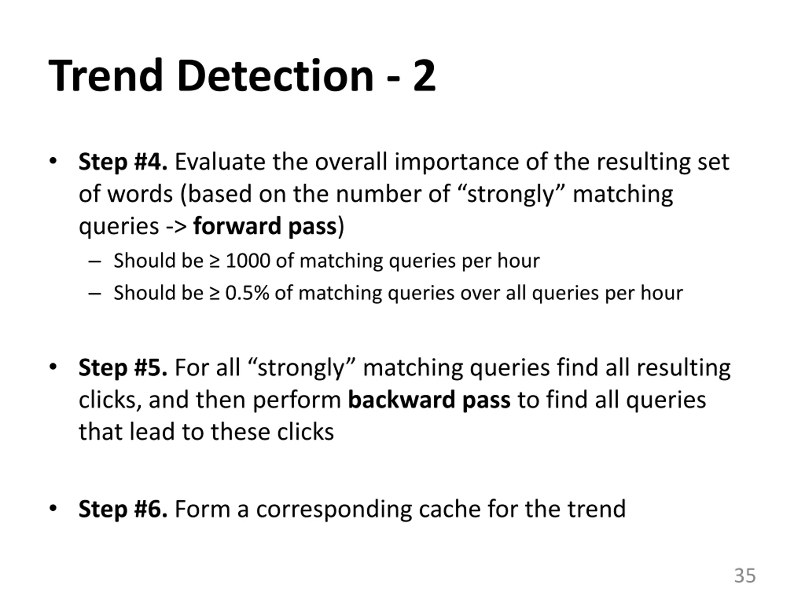 Trend Detection - 2 Step #4. Evaluate the overall importance of the resulting set of words (based on the number of strongly matching queries -> forward pass) Should be 1000 of matching queries per hour Should be 0.5% of matching queries over all queries per hour Step #5.For all strongly matching queries find all resulting clicks, and then perform backward pass to find all queries that lead to these clicks Step #6. Form a corresponding cache for the trend 35