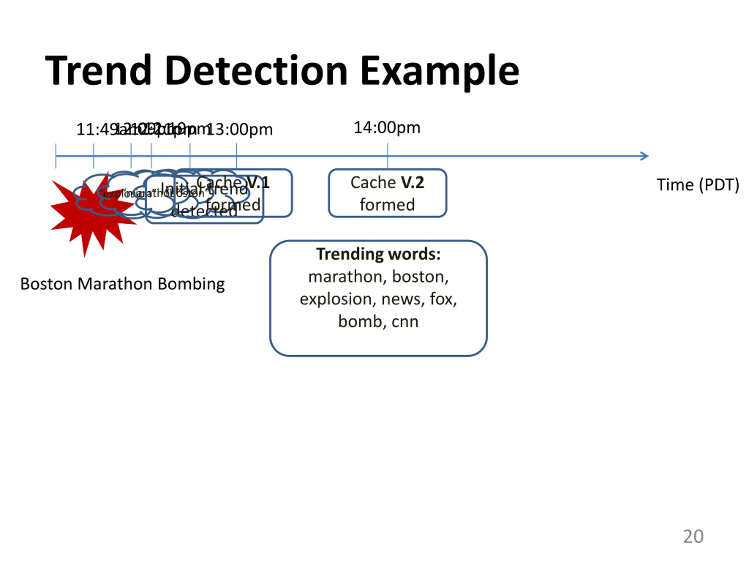 Trend Detection Example 14:00pm 12:09pm 12:11pm 12:19pm 11:49am 13:00pm Cache V.1 Cache V.2 formed Time (PDT) boston Initial trend detected formed explosion marathon Trending words: marathon, boston, explosion, news, fox, bomb, cnn Boston Marathon Bombing 20