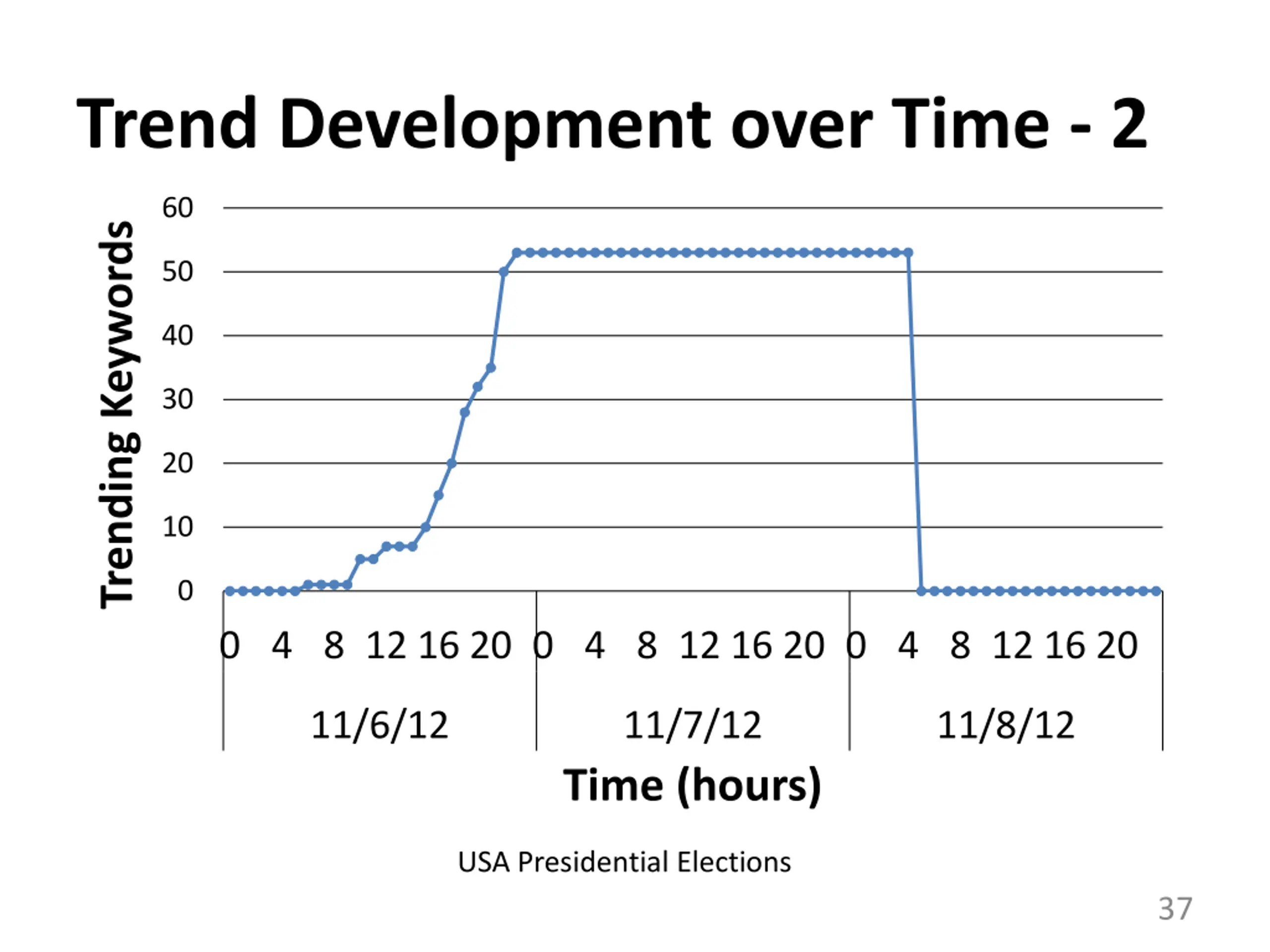 Trend Development over Time - 2 60 Trending Keywords 50 40 30 20 10 0 0 4 8 12 16 20 0 4 8 12 16 20 0 4 8 12 16 20 11/6/12 11/7/12 Time (hours) 11/8/12 USA Presidential Elections 37
