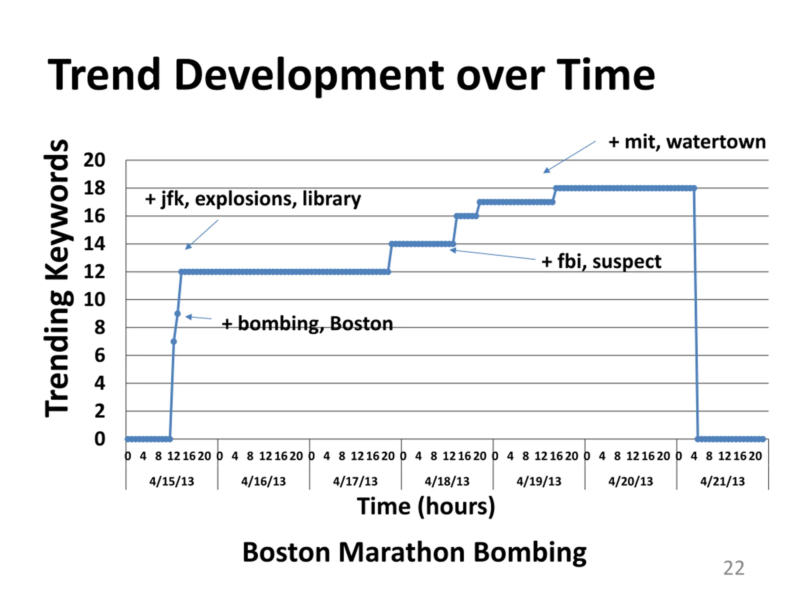 Trend Development over Time Trending Keywords + mit, watertown 20 18 + jfk, explosions, library 16 14 + fbi, suspect 12 10 + bombing, Boston 8 6 4 2 0 0 4 8 121620 0 4 8 121620 0 4 8 121620 0 4 8 121620 0 4 8 121620 0 4 8 121620 0 4 8 121620 4/15/13 4/16/13 4/17/13 4/18/13 4/19/13 4/20/13 4/21/13 Time (hours) Boston Marathon Bombing 22
