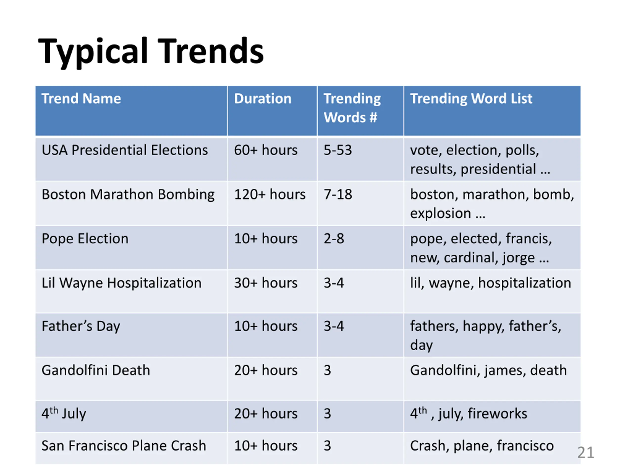 Typical Trends Trend Name Duration Trending Words # Trending Word List USA Presidential Elections 60+ hours 5-53 vote, election, polls, results, presidential Boston Marathon Bombing 120+ hours 7-18 boston, marathon, bomb, explosion Pope Election 10+ hours 2-8 pope, elected, francis, new, cardinal, jorge Lil Wayne Hospitalization 30+ hours 3-4 lil, wayne, hospitalization Father s Day 10+ hours 3-4 fathers, happy, father s, day Gandolfini Death 20+ hours 3 Gandolfini, james, death 4th July 4th , july, fireworks 20+ hours 3 San Francisco Plane Crash 10+ hours 3 Crash, plane, francisco 21