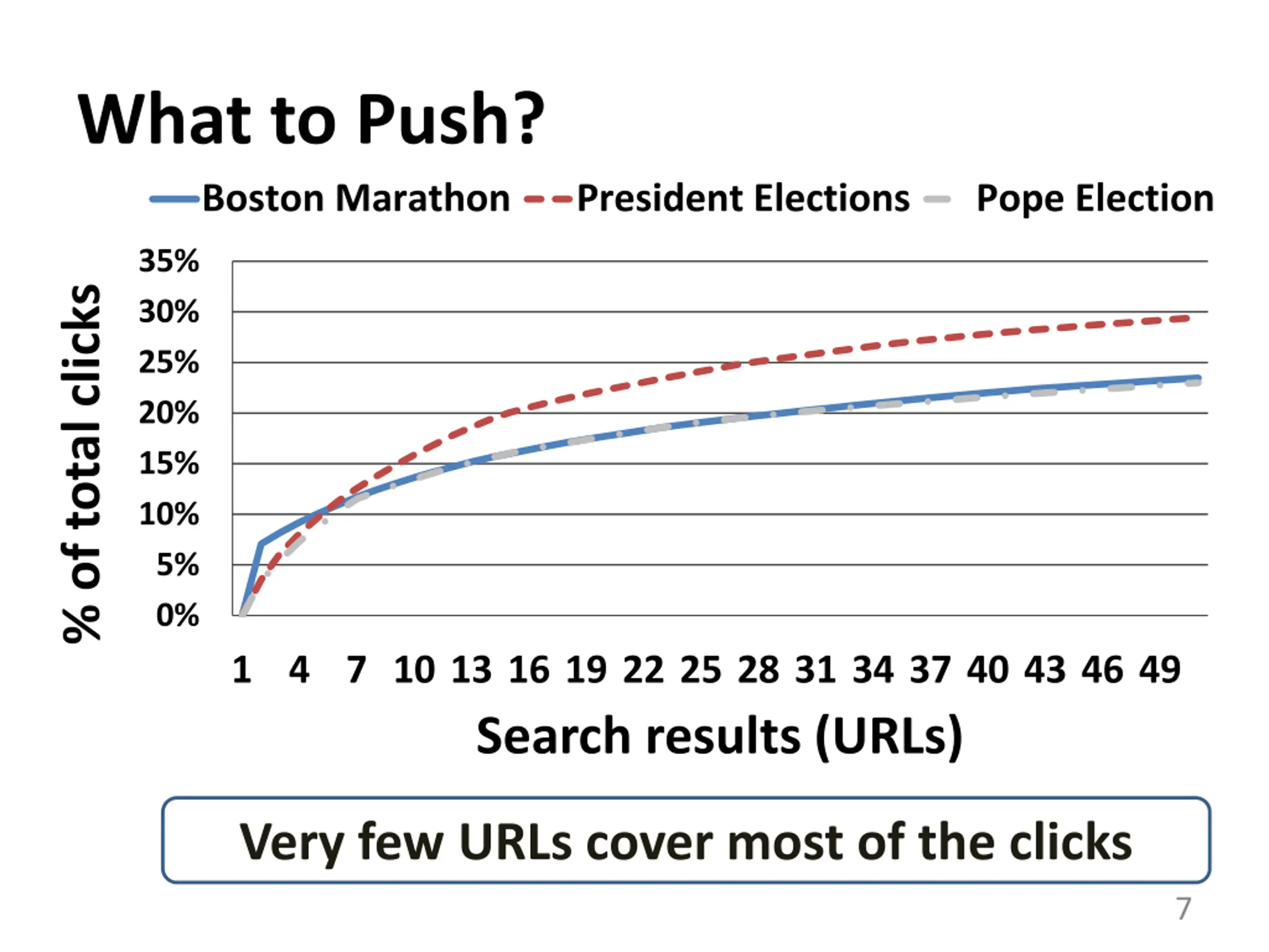 What to Push? Boston Marathon President Elections Pope Election 35% % of total clicks 30% 25% 20% 15% 10% 5% 0% 1 4 7 10 13 16 19 22 25 28 31 34 37 40 43 46 49 Search results (URLs) Very few URLs cover most of the clicks 7